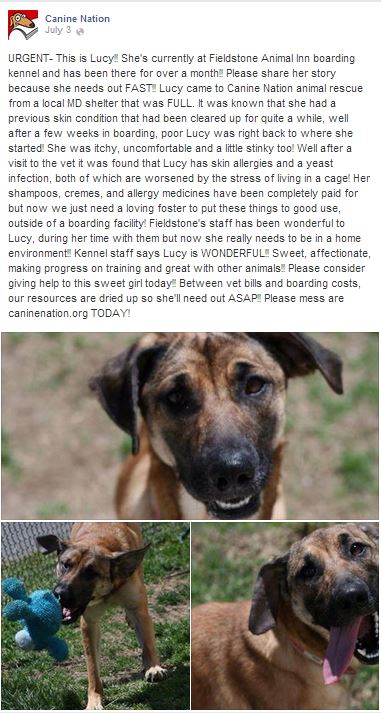 Let’s hop to it! Urgent foster needed and, of course, forever family. Lucy has been in boarding to long and she can’t take the stress! She is in Maryland. Contact CanineNation.org if you can help.