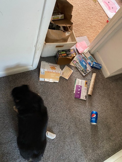 Charles here: One thing about living with older adult humans is that they can be forgetful. V was on the way from the kitchen (upstairs) to the garage (downstairs) with the recycling to put in the bin. But, on the way, something must have distracted V, because the kitchen recycling container was placed on the floor, on the way to the garage, and left there. LUCKY ME!!!!