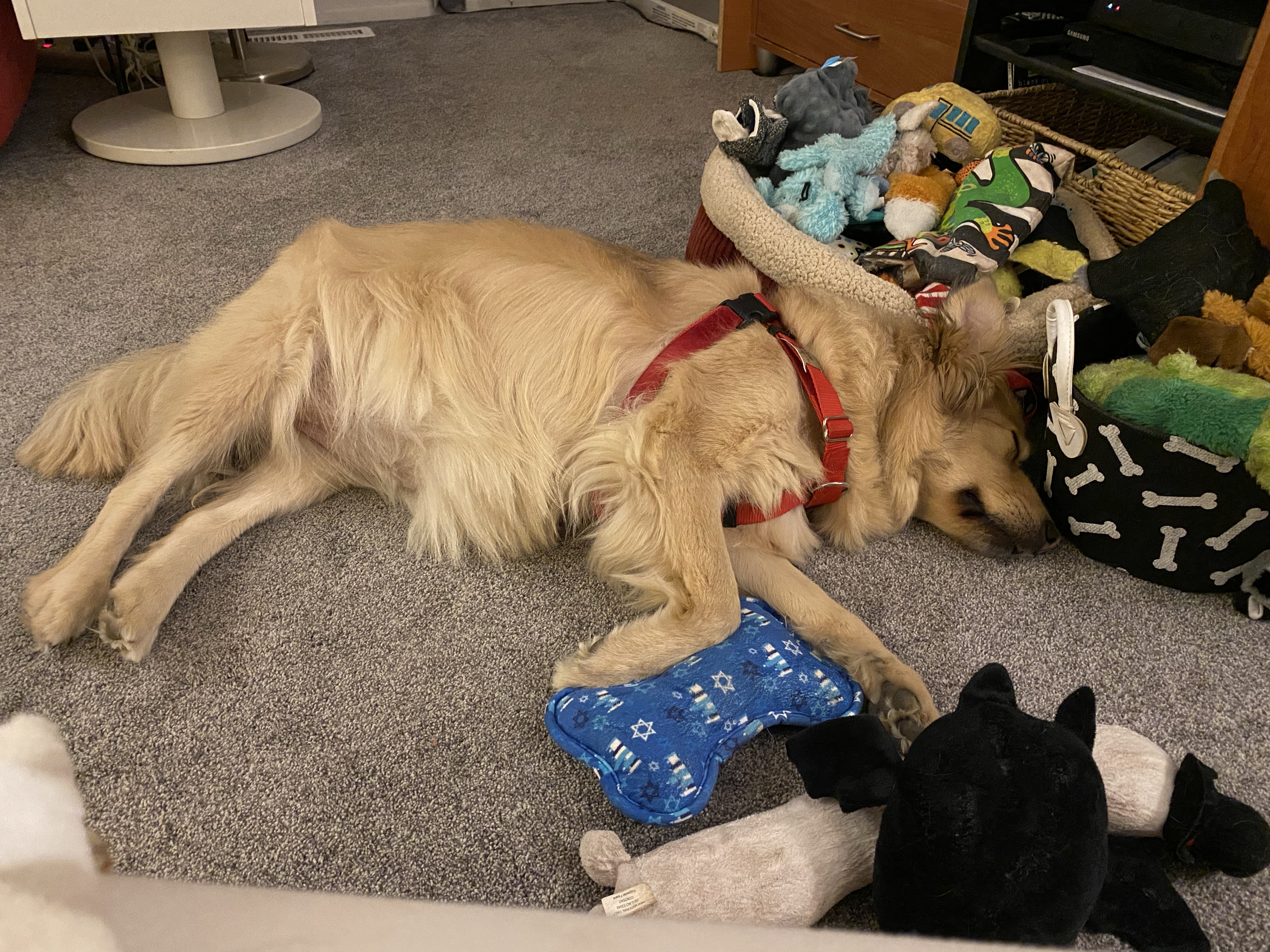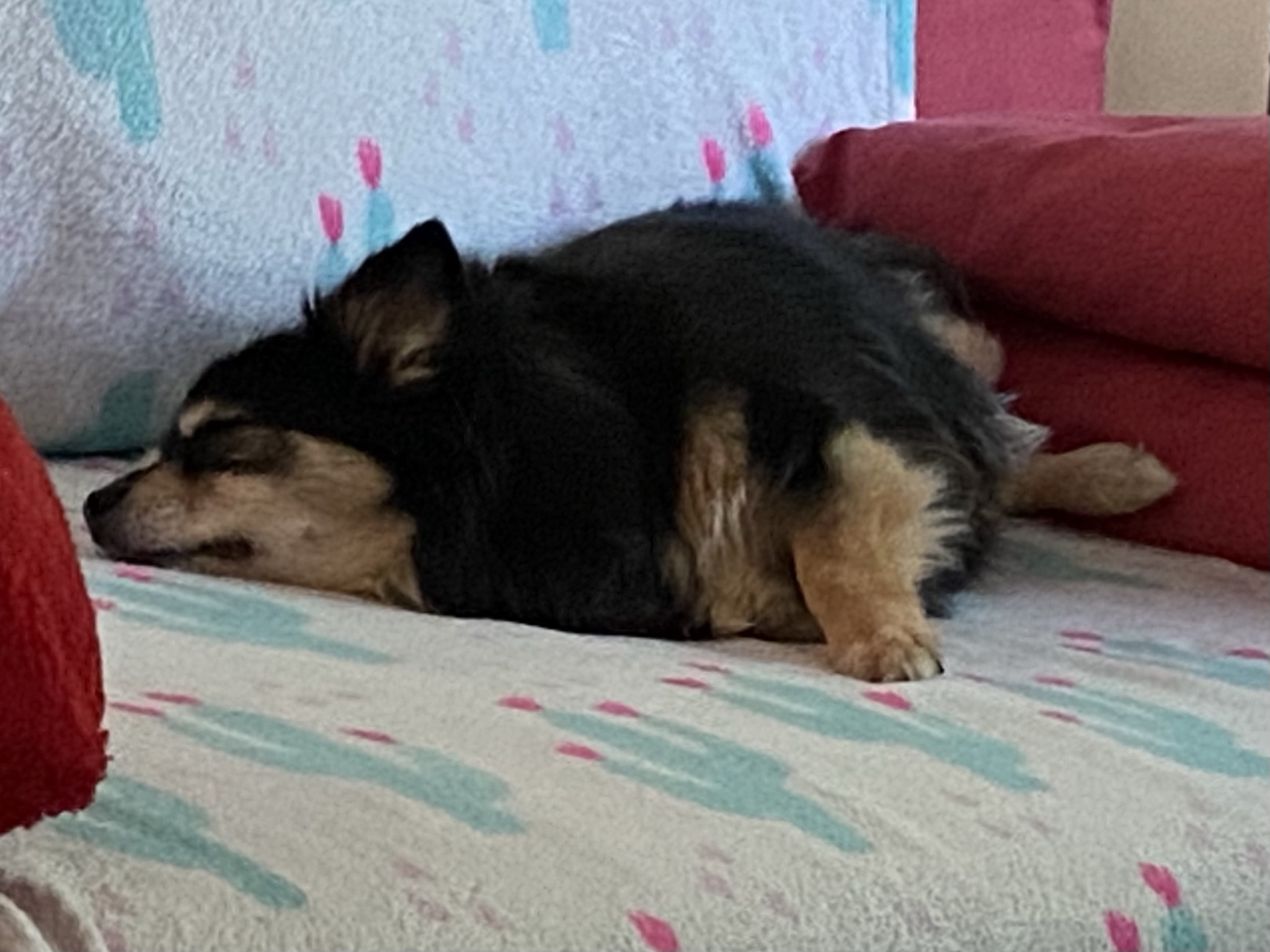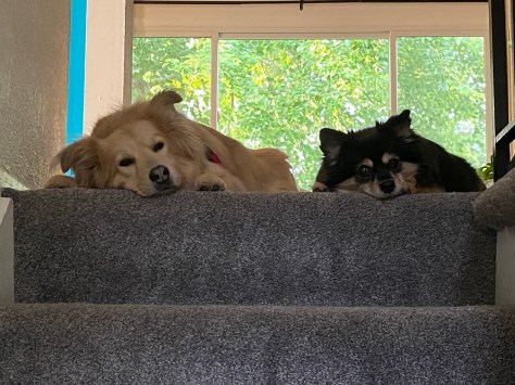 It was a strange spring this year. So hot in May with no rain that we had to start watering the plants, then some rain, no rain, cold, then thunder and lightning, then torrential rain, then hot again. But now we have entered the DOGDAZ of Summer! All we want to do is snooze inside the airconditioned house. Sofie won’t go outside half the time because she does not like the heat (but she does love to swim). Louise thinks maybe the front door exits to a cooler place than the back, so she is always trying a different exit.