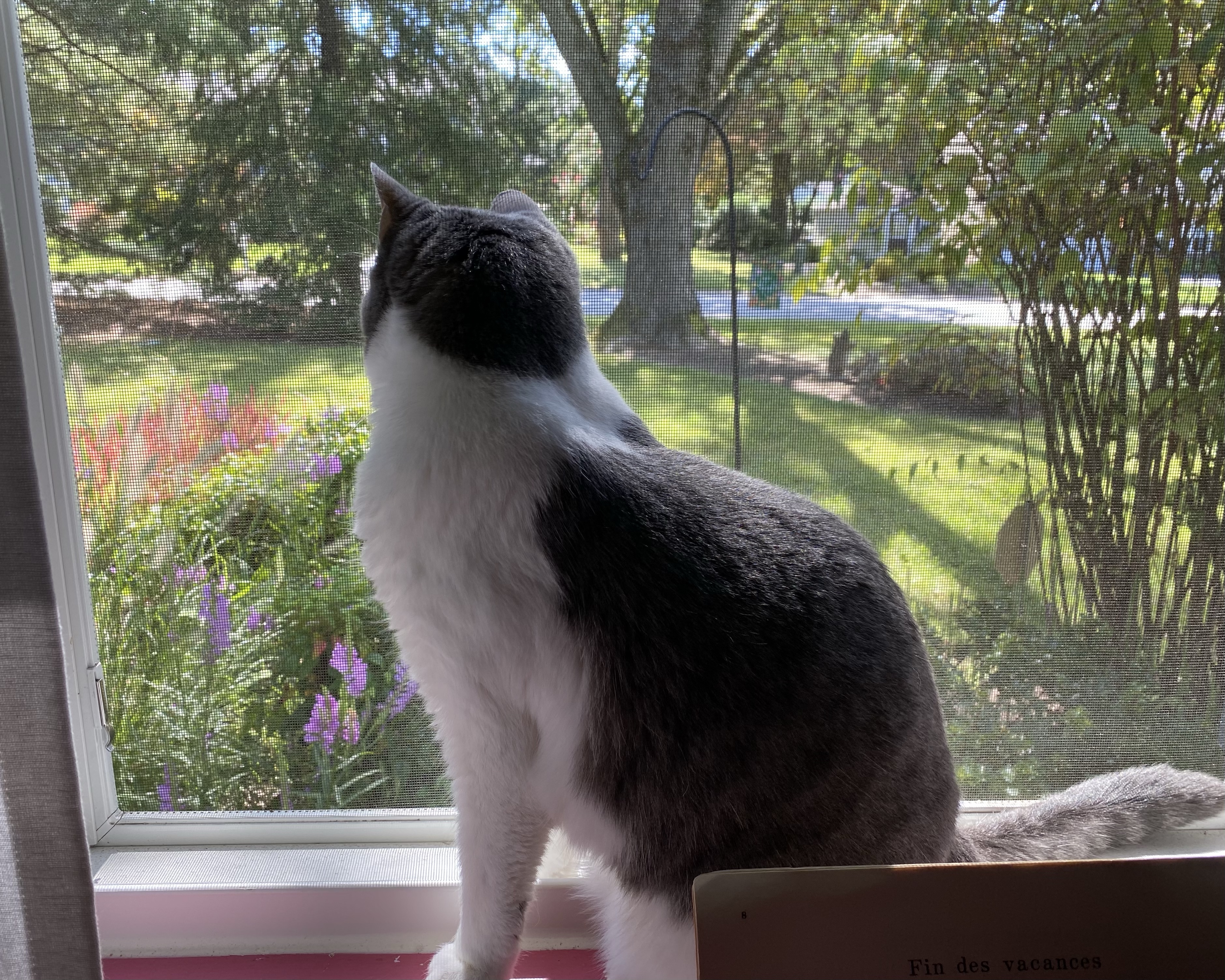 It looks like a normal day outside until Mom opens the door. Then…. blast! Heat comes at us like no tomorrow (what does that mean?). You would think we live in the tropics not the mid-Atlantic. Better to stay inside with the cats.