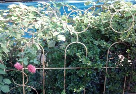Fall weather has come to the Mid-Atlantic. I want to show you my three rusty cats in the garden that hold up the raspberry canes and the late roses. They are very quiet cats and do their job very well.