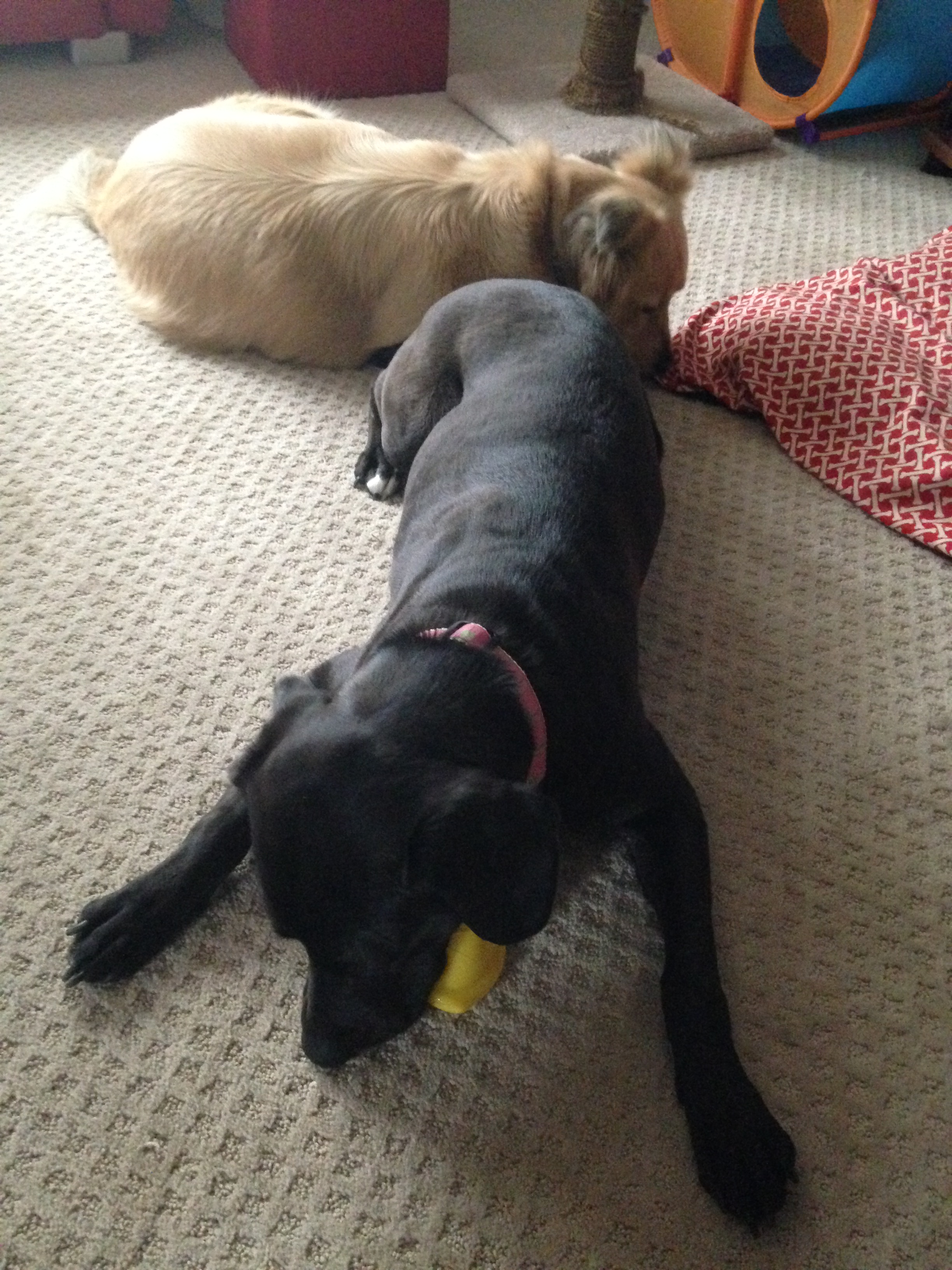 Oh, you were wondering where Sofie, the butt-in-ski, was during all this? Right behind Louise. But the energy made her anxious, so she was nibbling on the end of the dog bed as she does when she gets stressed. I love Louise’s splayed out legs to guard her squeaker. There is always mischief at the zoo.
