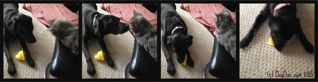 Mini Cooper really likes when Louise plays with her squeaky yellow Peep. So much so that she has crawled up really close from behind and actually tried to interact with Lu to get at it. I couldn’t catch that picture because I was too busy watching that Lu didn’t take a bite out of the kitten. Then Mini jumped up on the chair and tried from a different angle. The fact that Louise reached out and nudged her gently, nose to nose, blew me away. There is something special about Mini that the dogs really like. Louise did lie on the peep and make sure that Mini understood it was hers though. “It is my Peep, Mini Cooper! Keep your cat paws off it!”