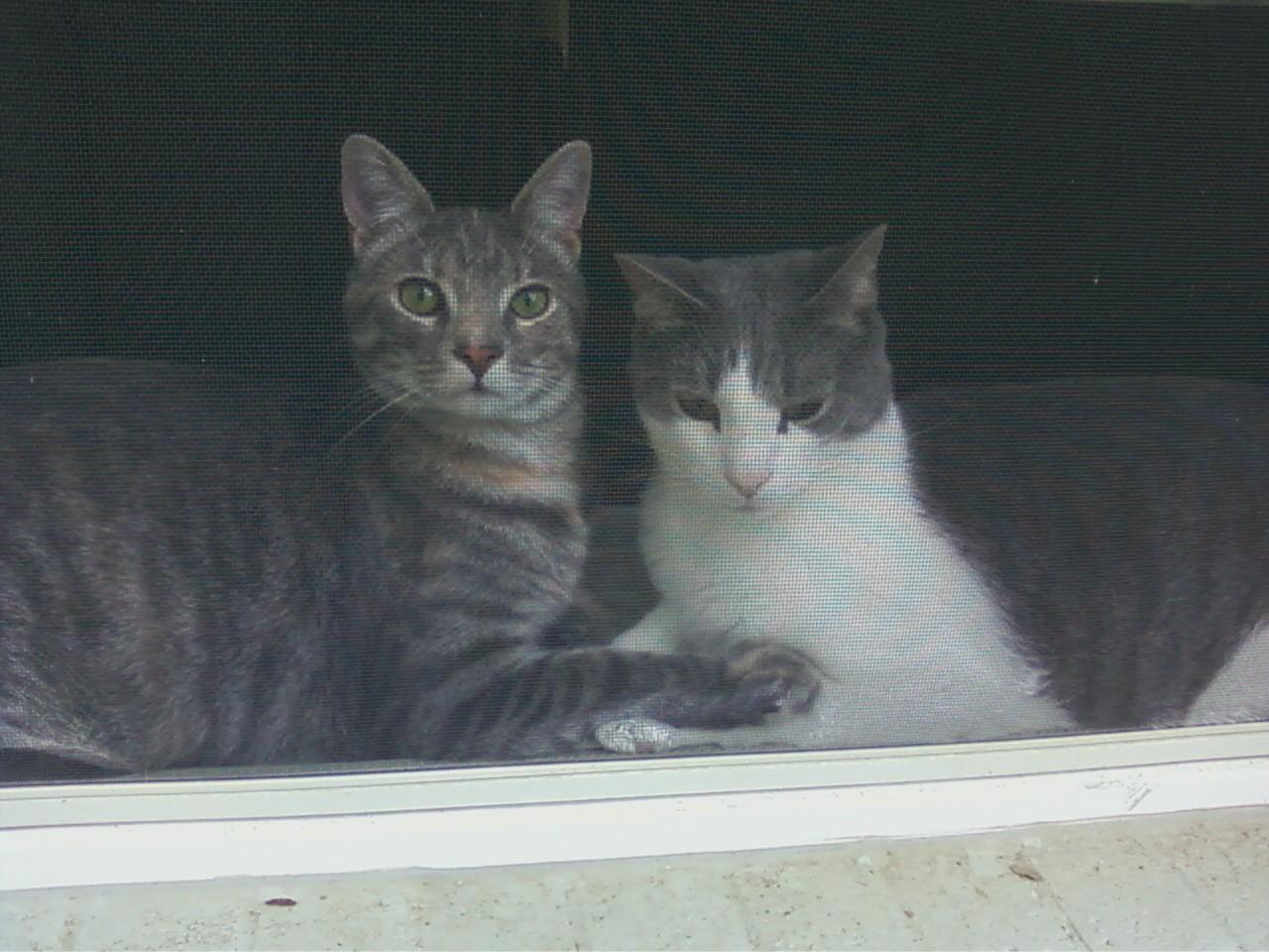 Oh Gosh! Mini Cooper just loves her brother, Nine (she is number 11). They are waiting for a skink to run by on the windowsill. This may look like a black a white picture but it isn’t – when you have a diluted torte and a gray and white Tom you get this effect. One of the girls took this on their iphone.