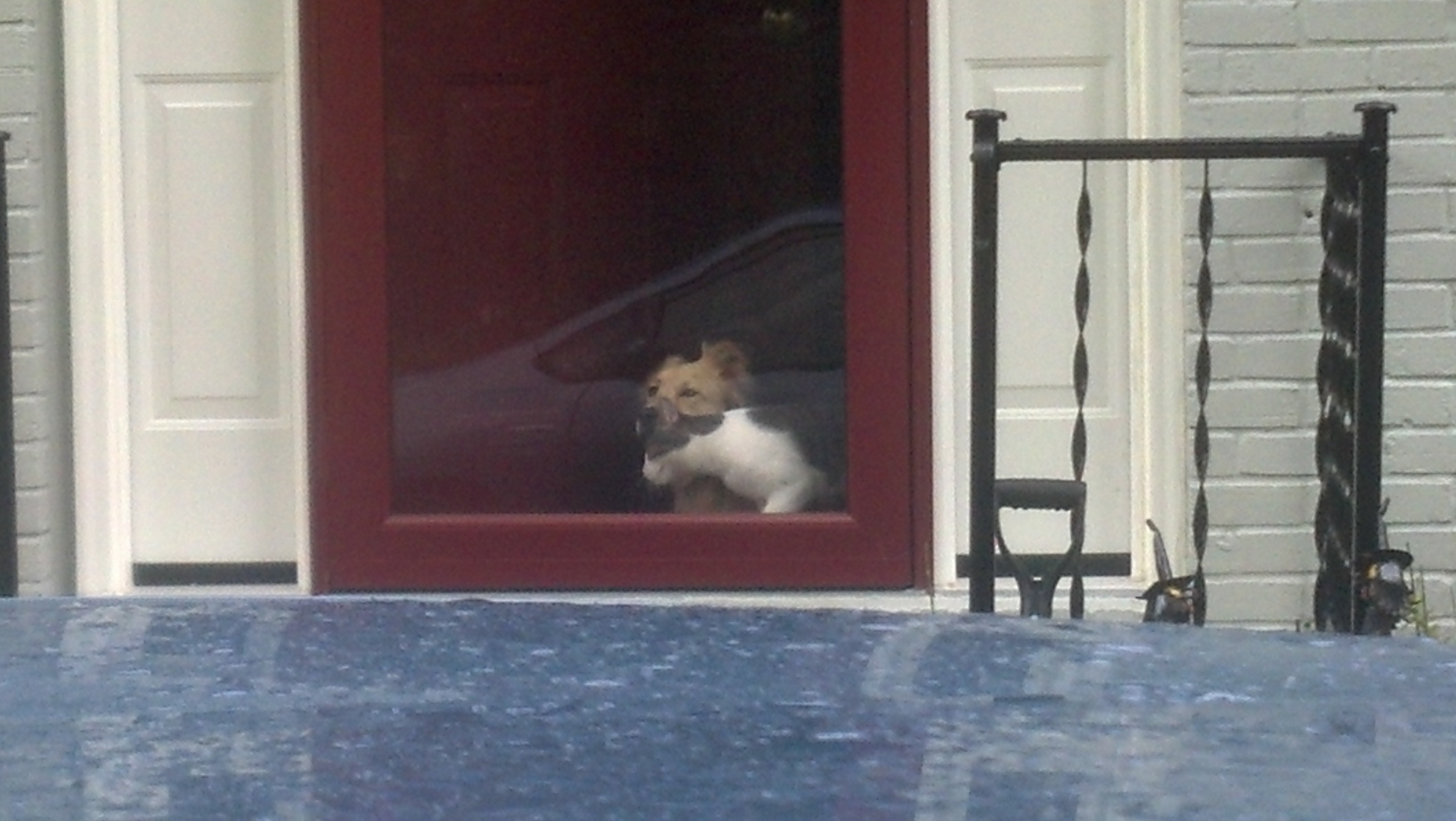 Here is a sequence of Sofie and Nine watching me drive away. (How sad is that?) You can see the reflection of the car in the front door glass. This was the image I was left with on my way to the airport. Two of my goofballs snuggling and watching me go. Notice how Sofie is straining to see me over Nine in the last shot. It is so wonderful how close the animals are. Sofie had no idea that Mommy would be gone a long time. She just knew that I was leaving the house and getting into the moving thing without her. I have talked about separation before, but this trip was a really hard one for me and for the animals and humans. Probably because of the length of time (10 days). For me, my animals are a calming and life enhancing force. I miss my humans very much too, don’t get me wrong. I need my humans as a constant sustainable energy of love and comfort, but the animals, my need for their presence is different. They give me a sense of peace. They are my home. They are the earth force that seems to remind me to eat and take walks during the day. Having so many animals, there is always someone near by wanting something; pet me, feed me, let me out, walk me, play with me, scratch my head, hold me …. I adore my zoo. I find great comfort in the company of animals. So, this is what leaving looks like at the zoo. What’s it like at your house?