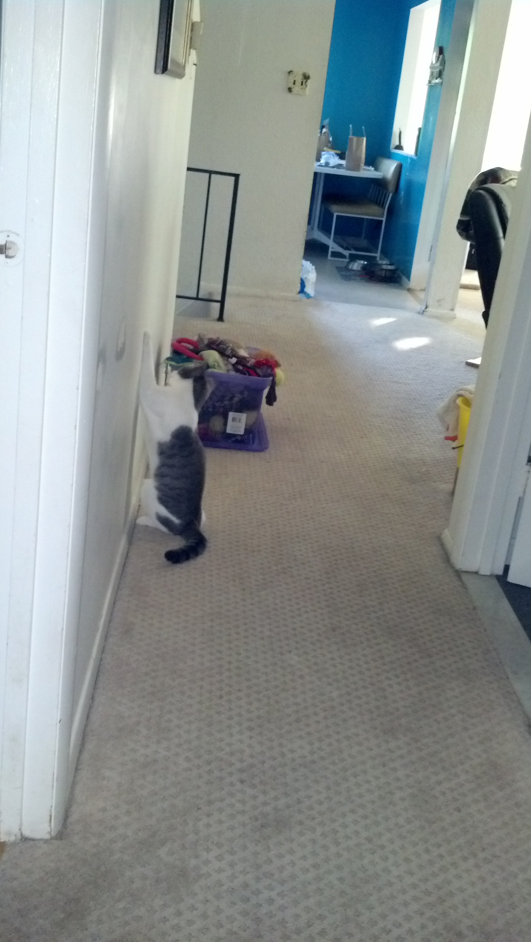 Monday Mischief included silly Nine boy chasing light dots up the wall. He is a crazy kitten, I would not be caught dead chasing light dots (but maybe a laser thingy). Mommy had a laser thing once, but she left it on the coffee table and it disappeared. I assume Nine has it stashed under the couch with a lot of other toys of his.