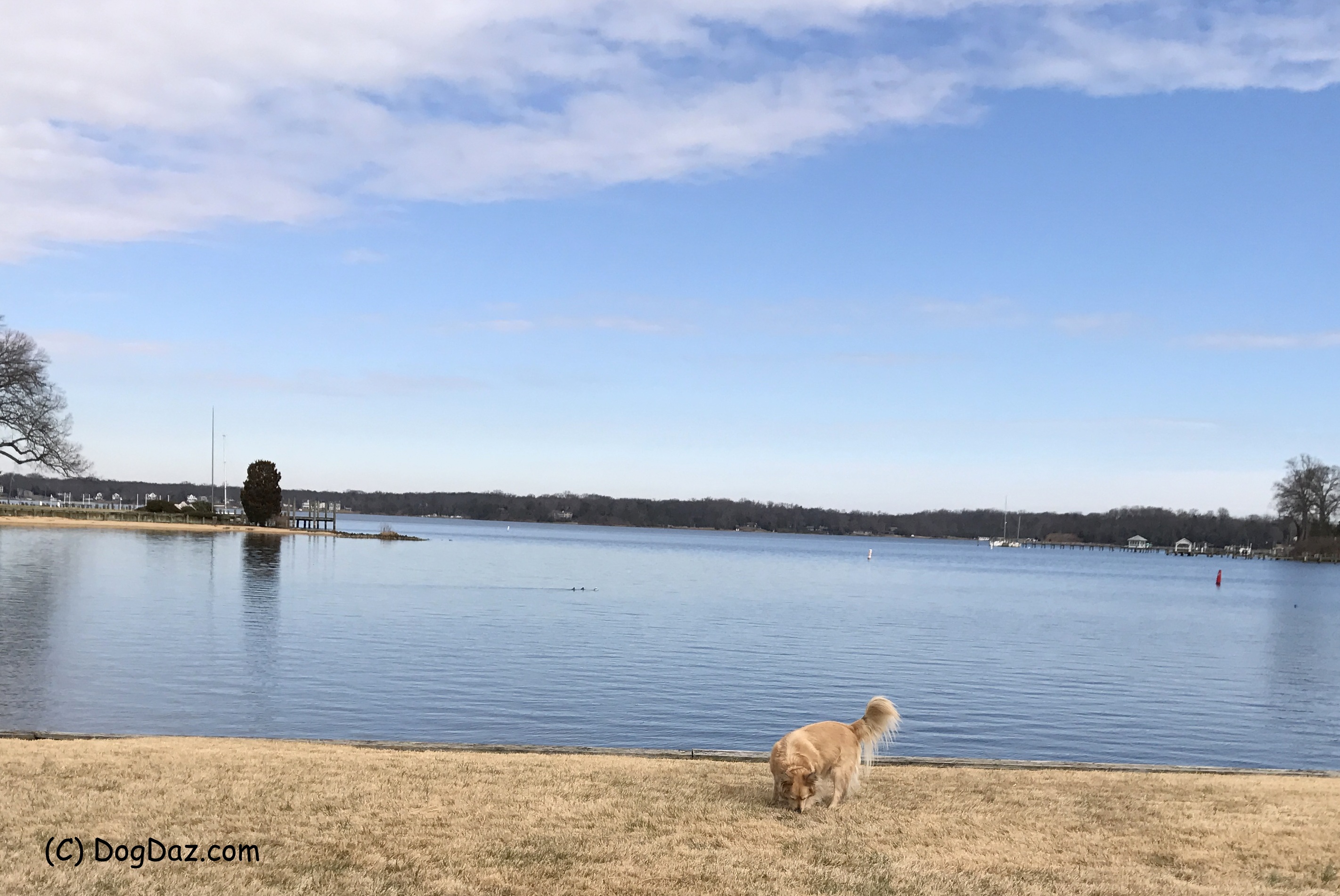 Do you see the ducks to the left of Sofie in the water. Luckily they were far enough out that the dogs didn’t try to swim on this cold day. And, I am not sure what the little man will do since the adult ducks are almost as big as he is.