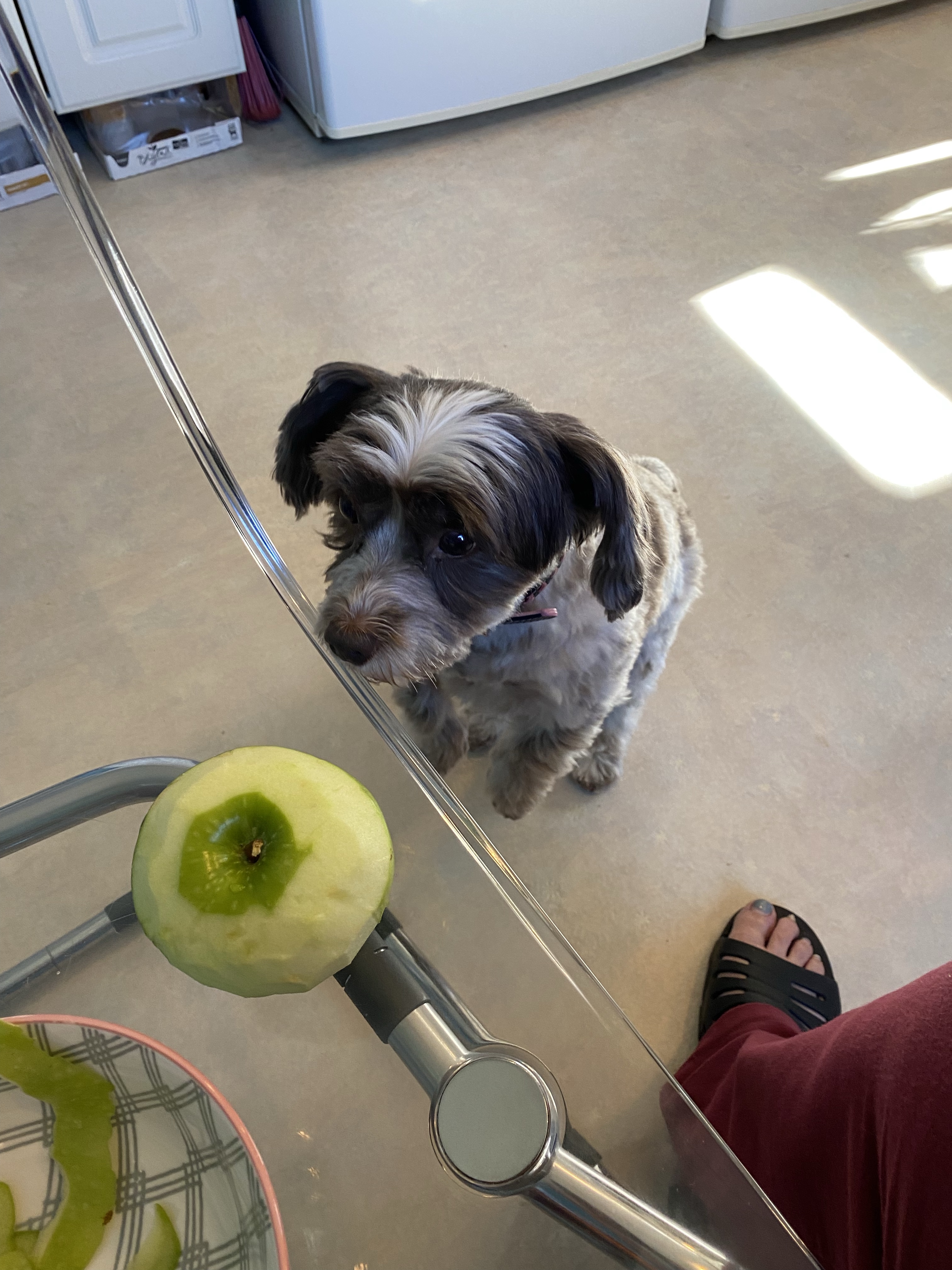 She did let me watch and she even gave me some apple to chew on. But she would not let me have the whole thing. She said something about how apple seeds could make me crazy and even possibly kill me.
