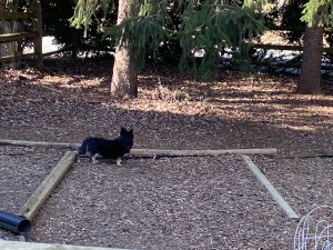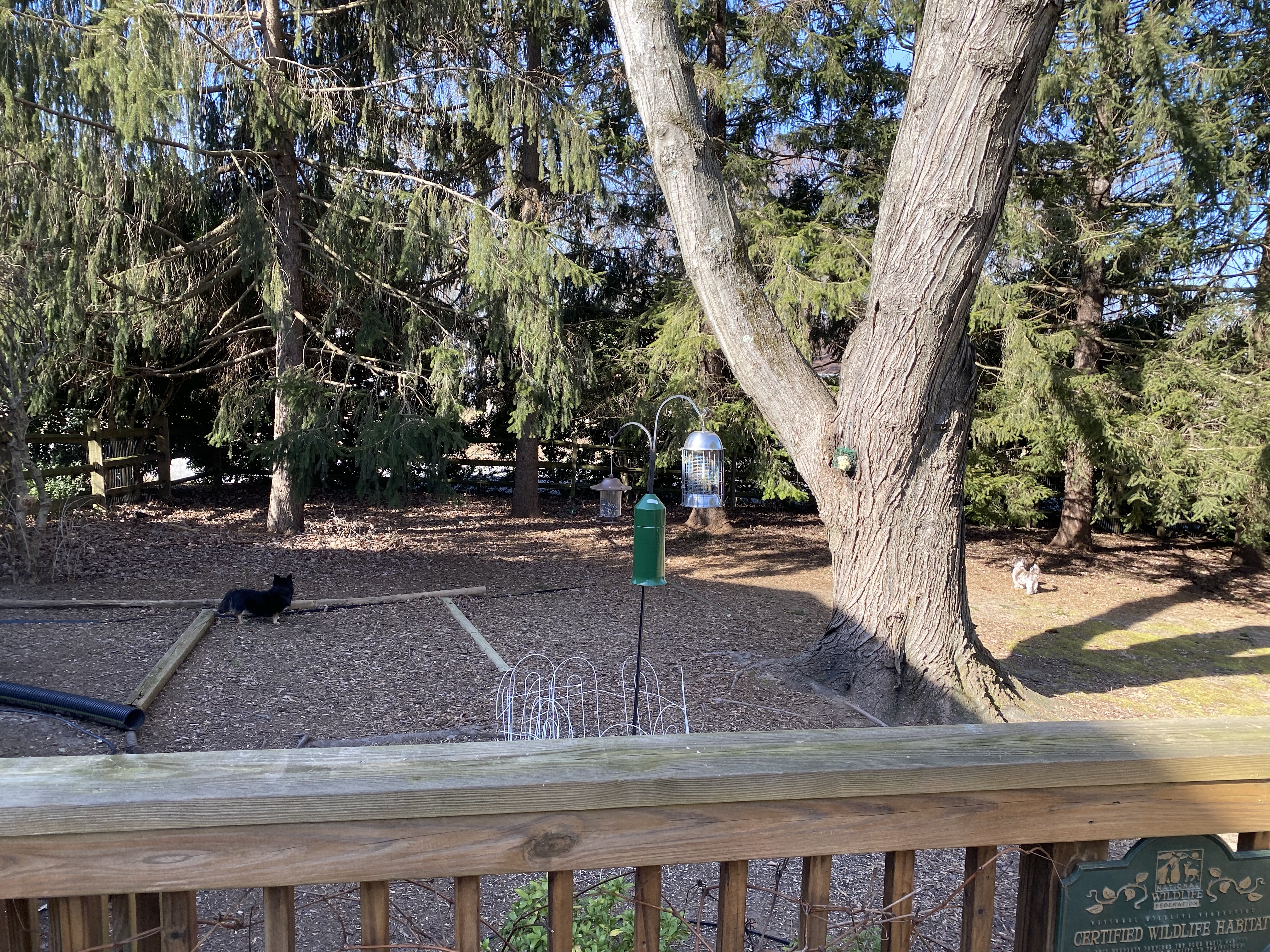 I noticed that as the security guards we hire get smaller in size, they have a lot more yard to cover. They appear to get further and further from the big tree so that they can see what is happening. It looks to me like Charles and Jolie have worked out their parameter strategies. I must say that Jolie is very fast whenever a squirrel touches down.