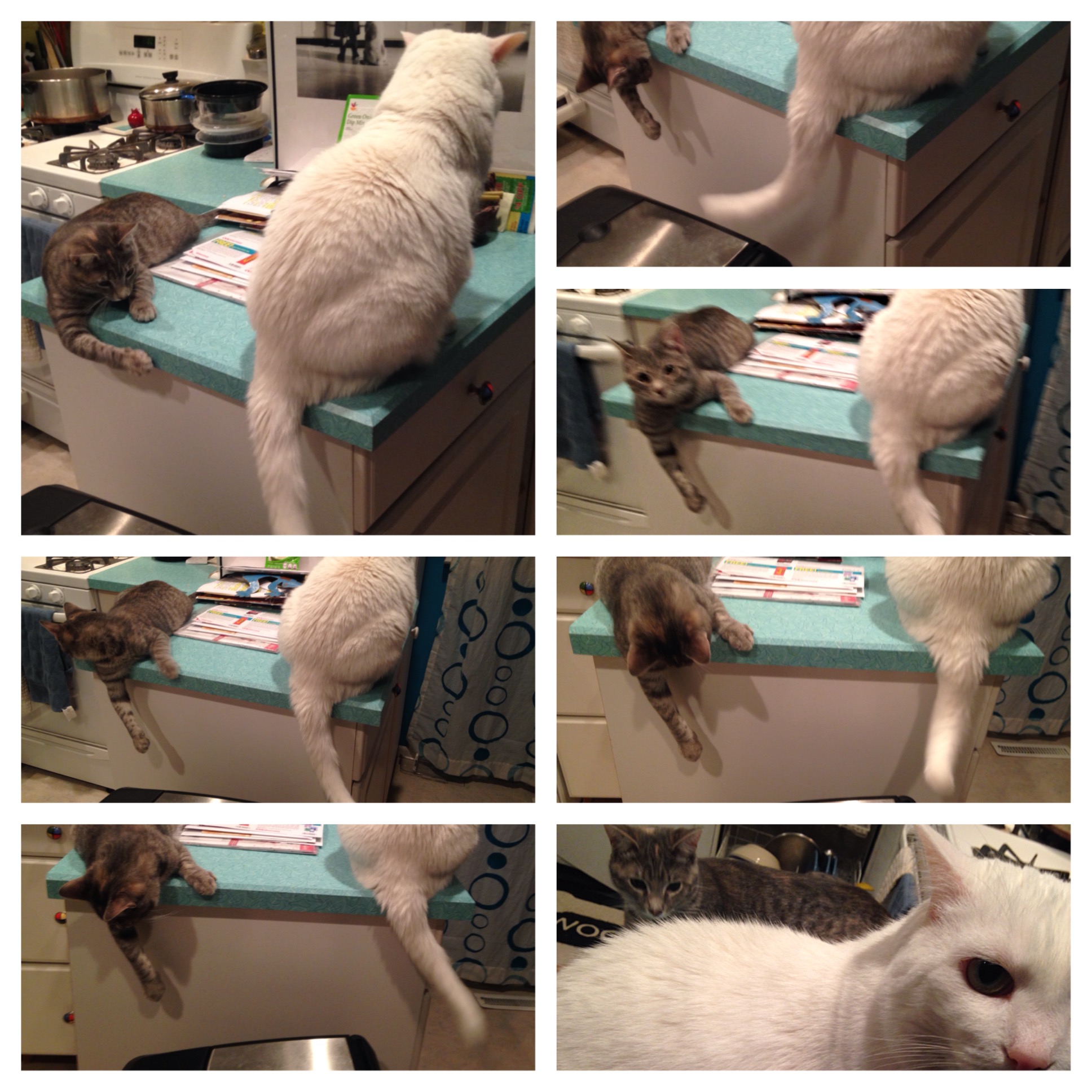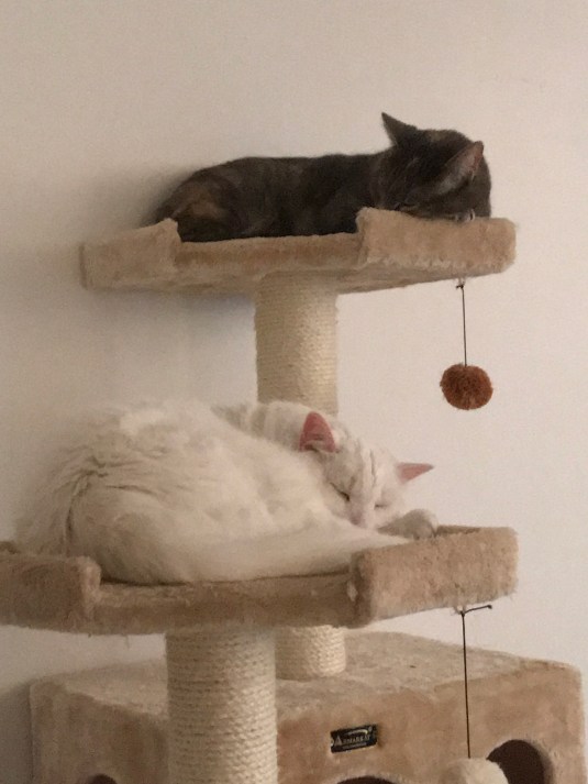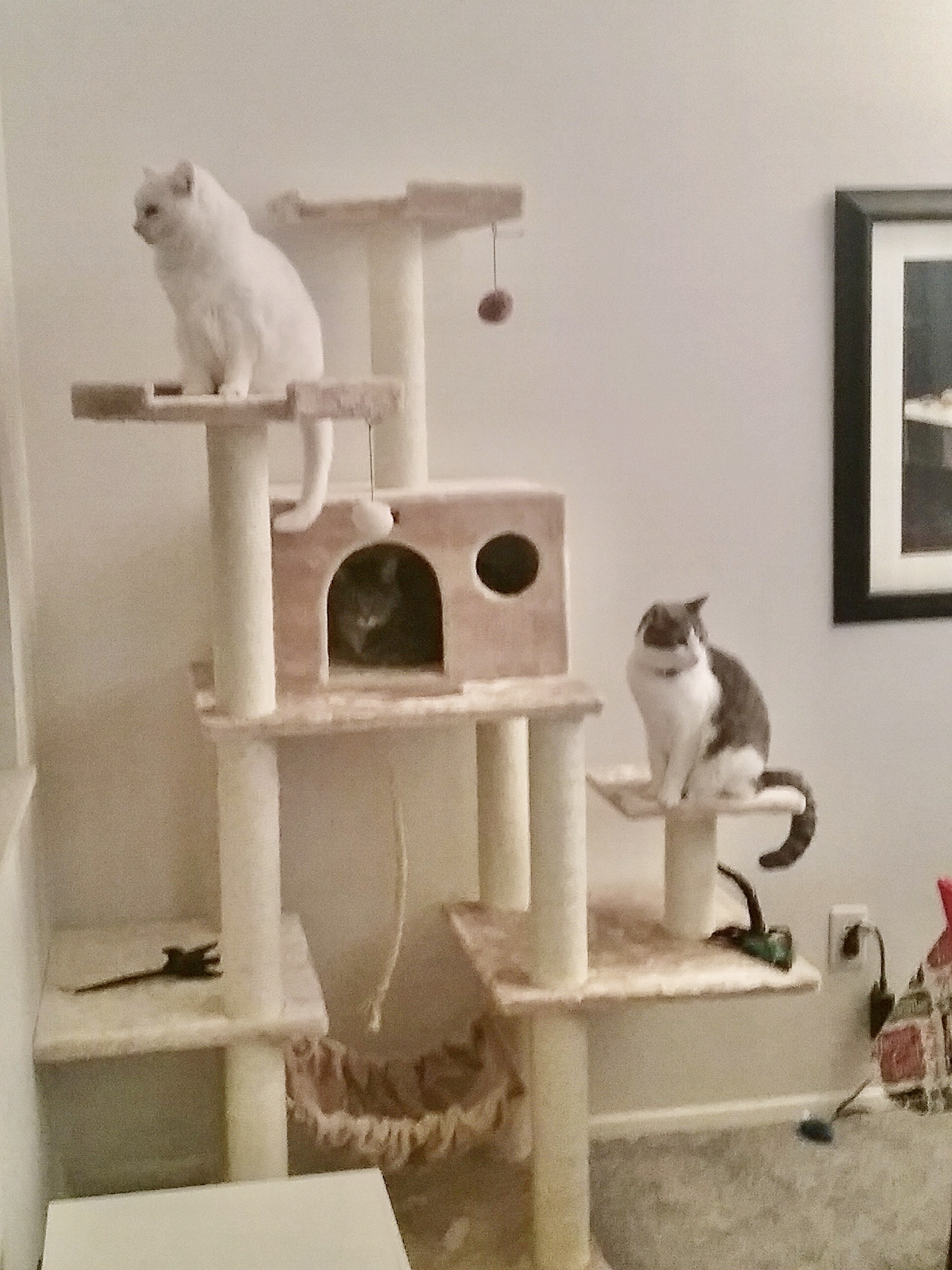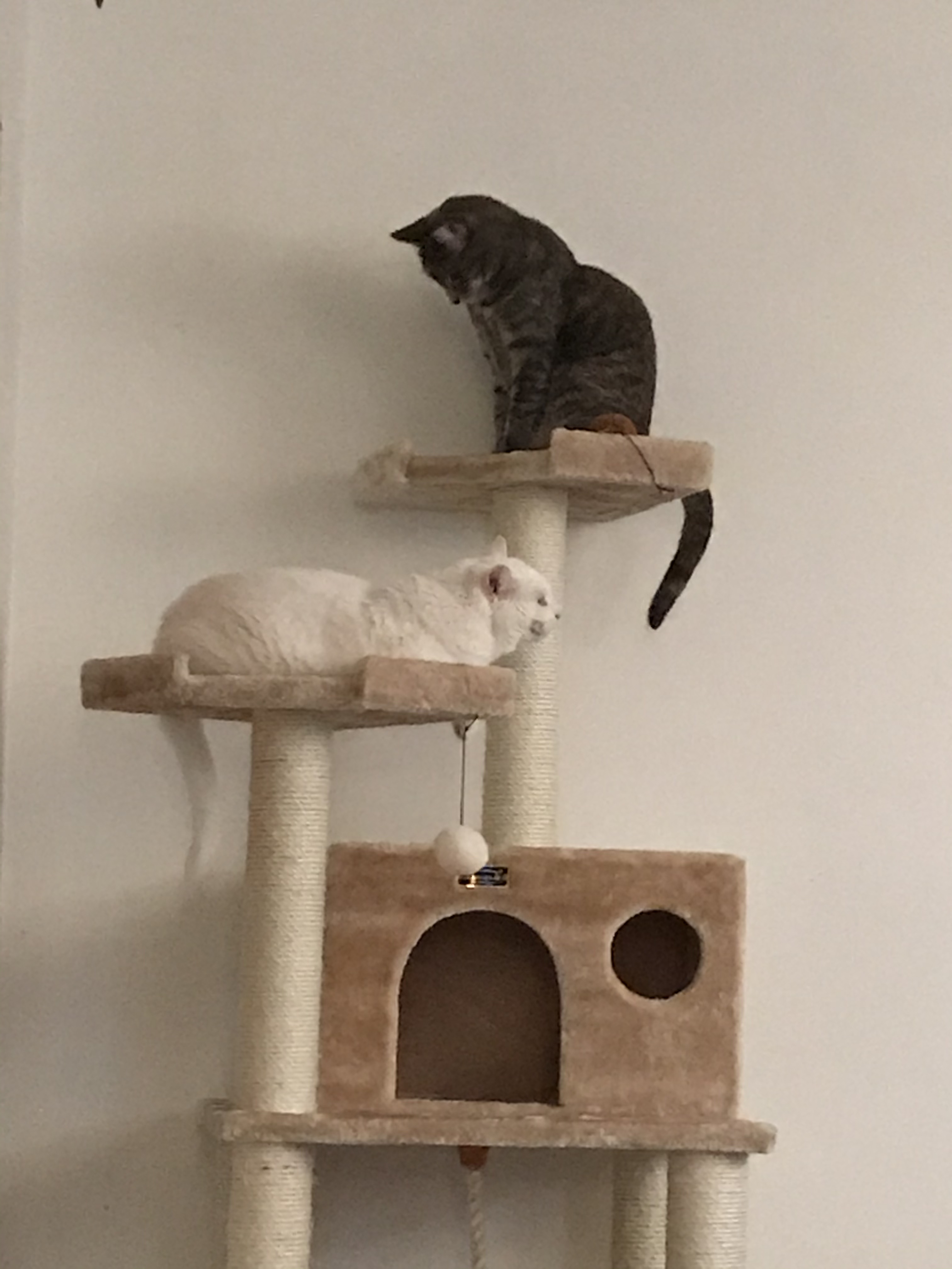 Mini and I have temporarily worked out our differences by having a tiff and then moving to the platforms of the cat village. There is currently a detent between us, at least until I want something she has (or vice versa).