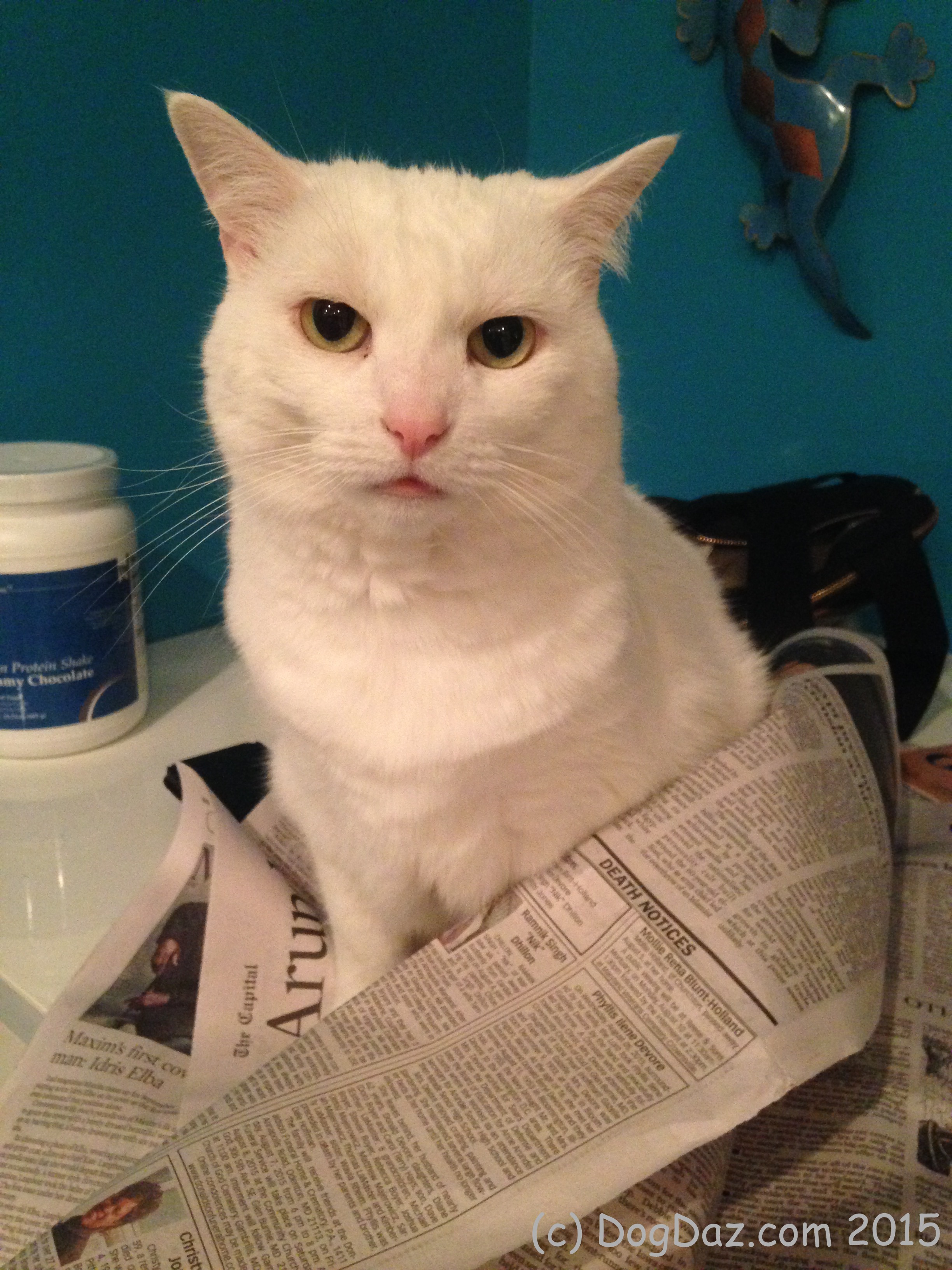 Queen Noel, the Christmas Cat, here, posting on the current situation at DogDaz Zoo: The humans are in the house all day, every day, and taking up a great deal of our space and oxygen. Mini has decided that Mom’s chair is now her chair, but I want it! So I think I will just sit on her until she moves. Which she doesn’t. I think I may need to use force.