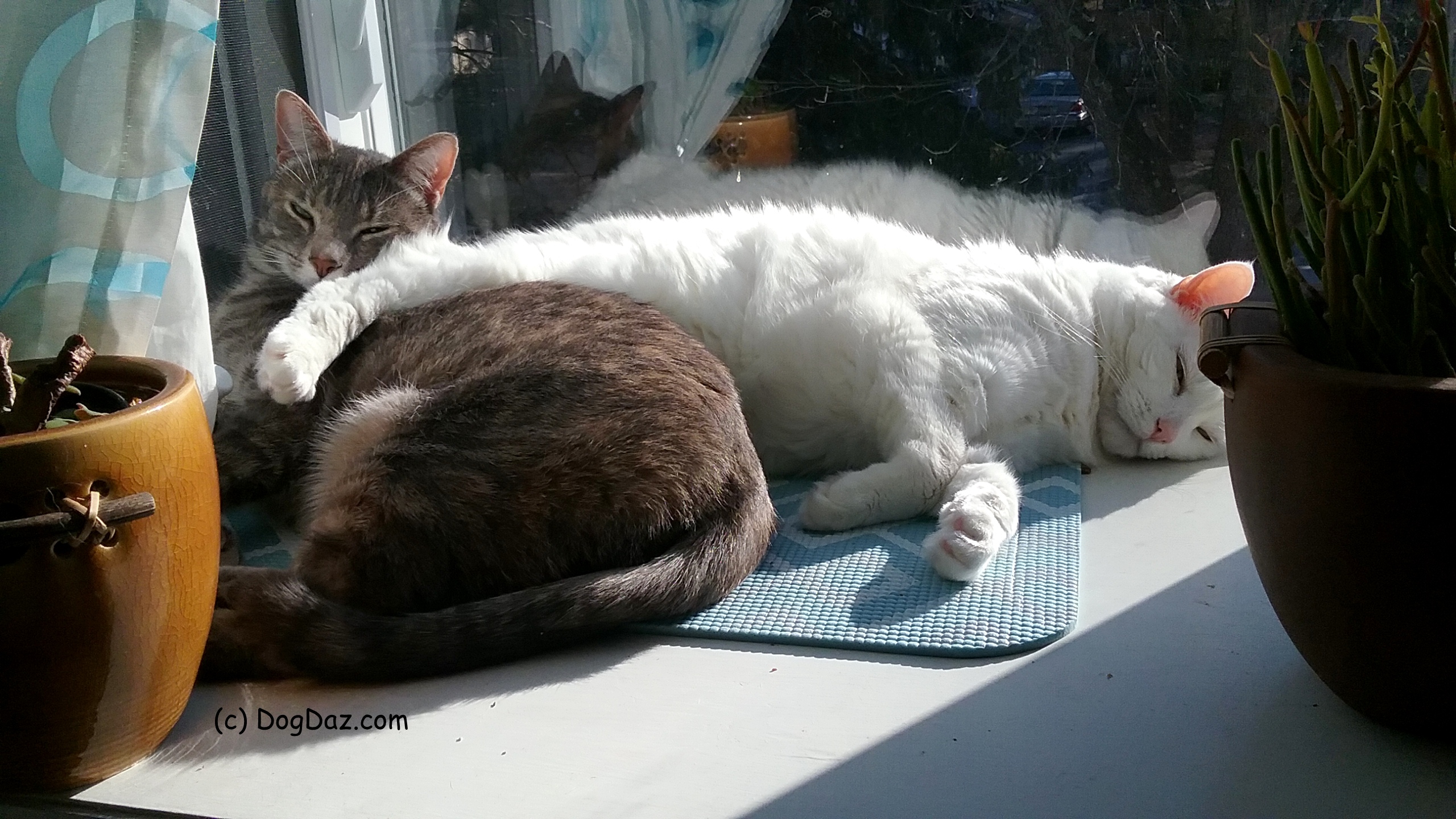 Oh Gosh! Mini Cooper just loves her brother, Nine (she is number 11). They are waiting for a skink to run by on the windowsill. This may look like a black a white picture but it isn’t – when you have a diluted torte and a gray and white Tom you get this effect. One of the girls took this on their iphone.