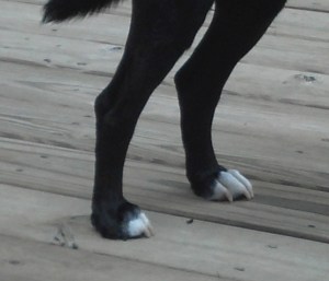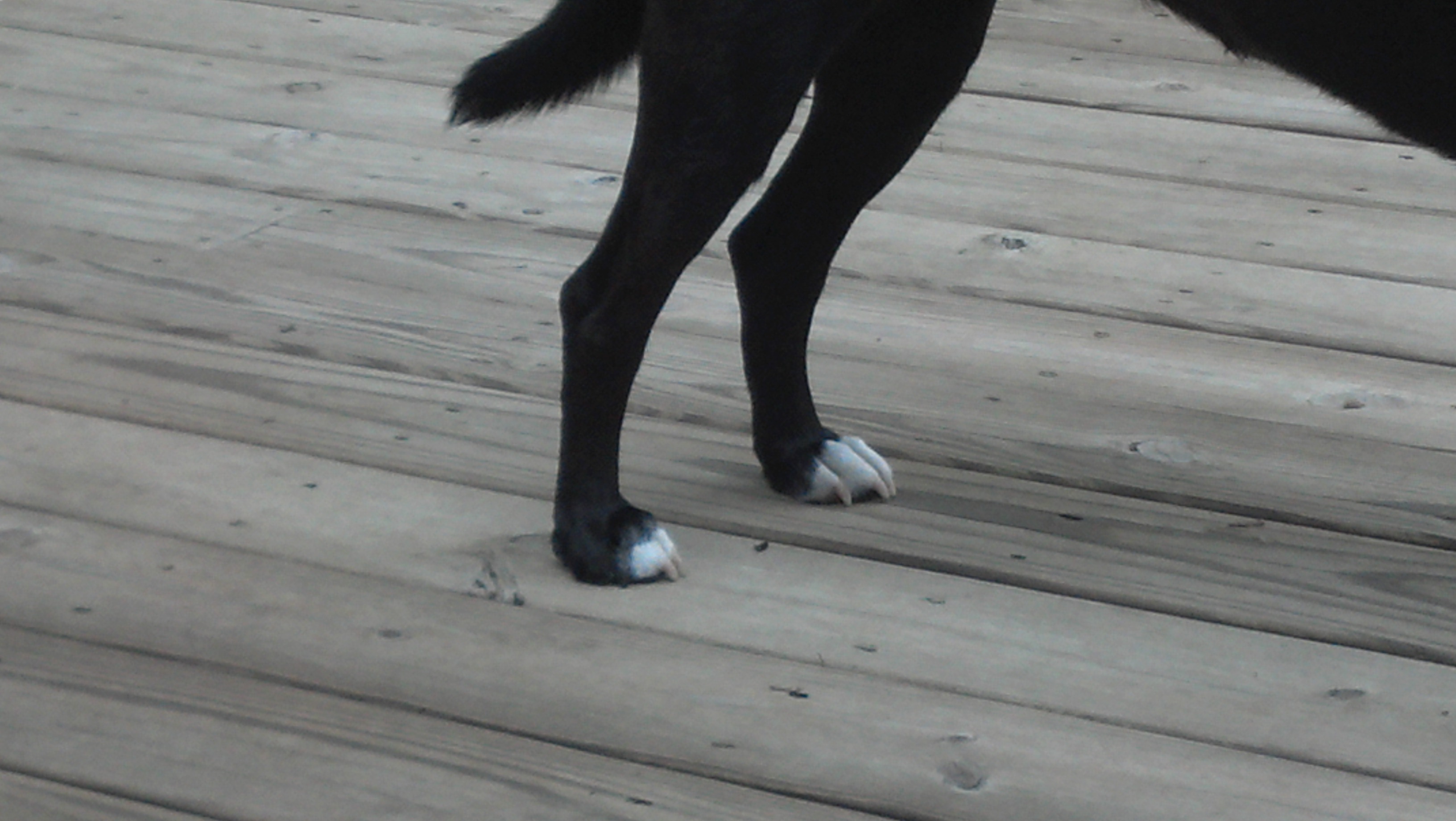 Louise’s back toes are all white on the left and mostly white on the right. She has what we call here at the zoo: “Milky Toes.” I am not exactly sure where the name came from, I only know that K8 has a stuffed dog toy ever since she was a little girl that she named “Milky-Toe.” No one knows, or remembers, why. We thought about naming Louise that when we first adopted her, but the name ‘Louise’ just seemed to fit her so well, so we kept it. (Note: They also wanted to name her ‘Harlo,’ which would really not have fit now that I know her.)