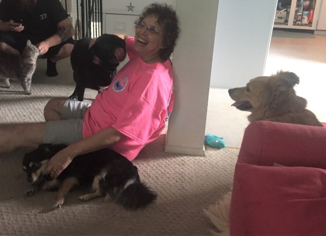 A storm was coming, as is usual in August. K8 snapped a picture of all 3 dogs hoping that I could save them from the impending booms. It is rare that you get a shot of me with all of them. I love my goofballs.