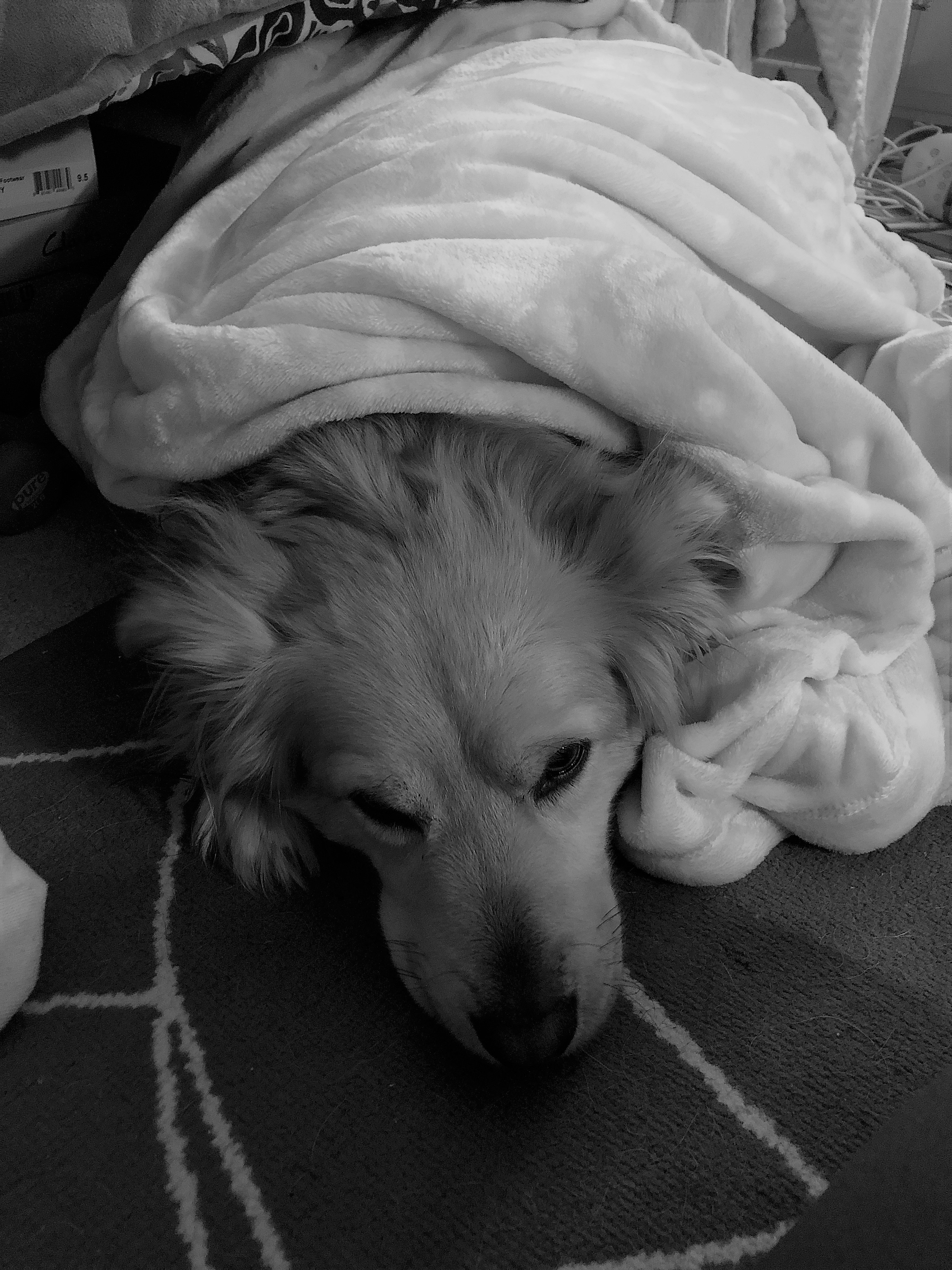 Peanut sent me this picture while I was at work the other morning around 8 AM. Sofie was hiding under a blanket in her room as a storm raged outside.