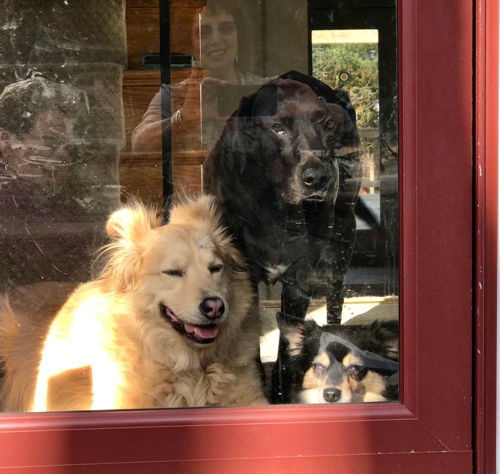 Mommy has a hard time getting a picture with us so she took a picture of her reflection in the front door while we were looking out at her. It shows all of us in one shot. V is also in the picture if you look really hard.