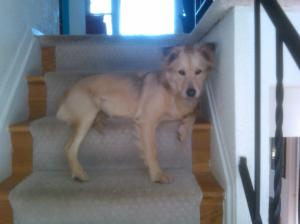 Sofie keeps an eye on the front door waiting for me to come home. She likes to watch the world go by from this vantage points (and she has also figured out that it is an effective blocking strategy so that the cats can not get up the stairs). I think it is interesting how dogs react when their humans return whether from a 20 minute trip to the grocery store or a 5 day trip out of town. My dogs greet me with great joy and the feeling that I am the most important human in the world. Sometimes I wonder how dogs perceive time. They appear to have a rhythm to the moon cycles but do they perceive time as the period between sleep? Is a day maybe one feeding to the next? If a human has gone away is the day over when the human returns (no matter what the length)? How long is a dog day? Just another DogDaz morning back home with my zoo ❤