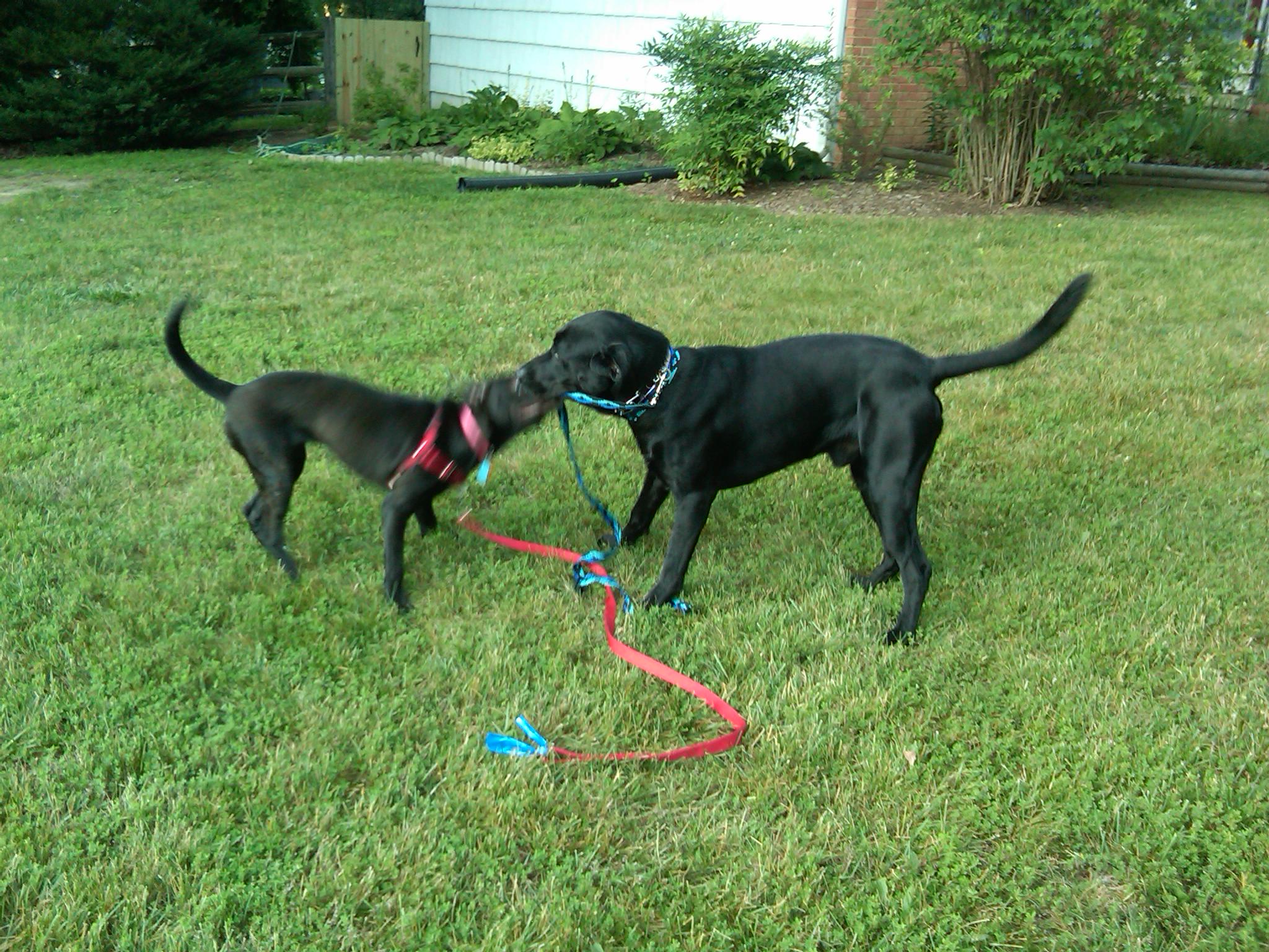 Both Louise and Sofie have boyfriends. I am not sure they know what that really means since they are both spayed females, but they sure do like their boys. Mojo lives next door. Lulu has played with him since she was a puppy. She waits by the kitchen window (which faces his house) and watches for him. She knows when he is walking by the house even if all the curtains are drawn. She gets blue if she does not see him during the day. We walk with Mojo almost every day. She looks at him different then any other dog (or is that me anthropomophizing.) Mo is about 4 years old. He is an absolutely gorgeous champion dock diving black lab (she could do worse, right?).