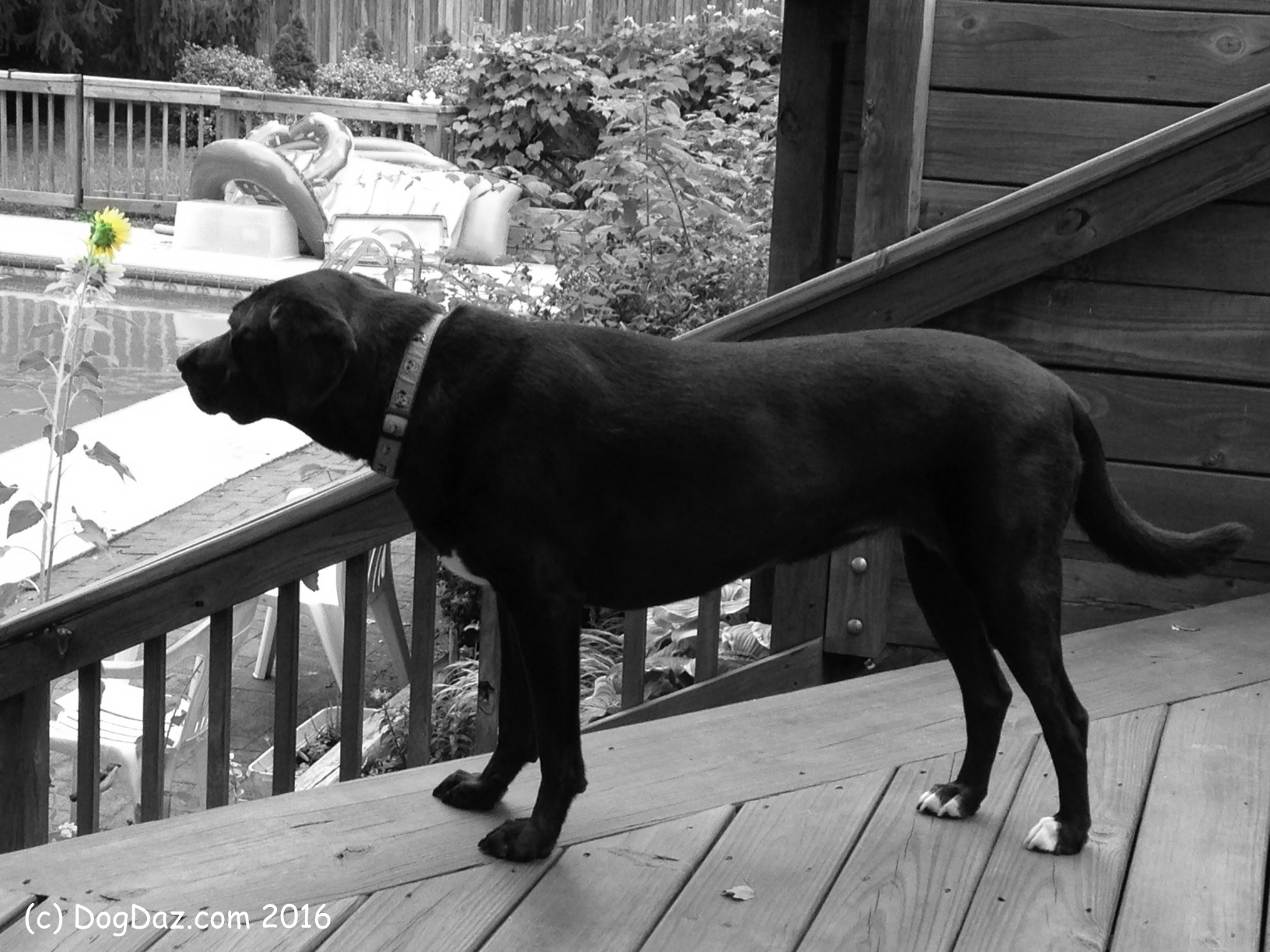 Louise stands at the edge of the deck for the longest time. I guess she is surveying her territory. On the other side of the pool is a busy bird feeder and there is always a lot of activity going on. This is a really good vantage point from which to see if the villainous squirrels are stupid enough to come into the area. I feel sorry for the squirrels in our yard because when I let the dogs out – zoom, zoom, zoom – they know just where the squirrels are going to be and they run them up the trees, fences, and power lines.