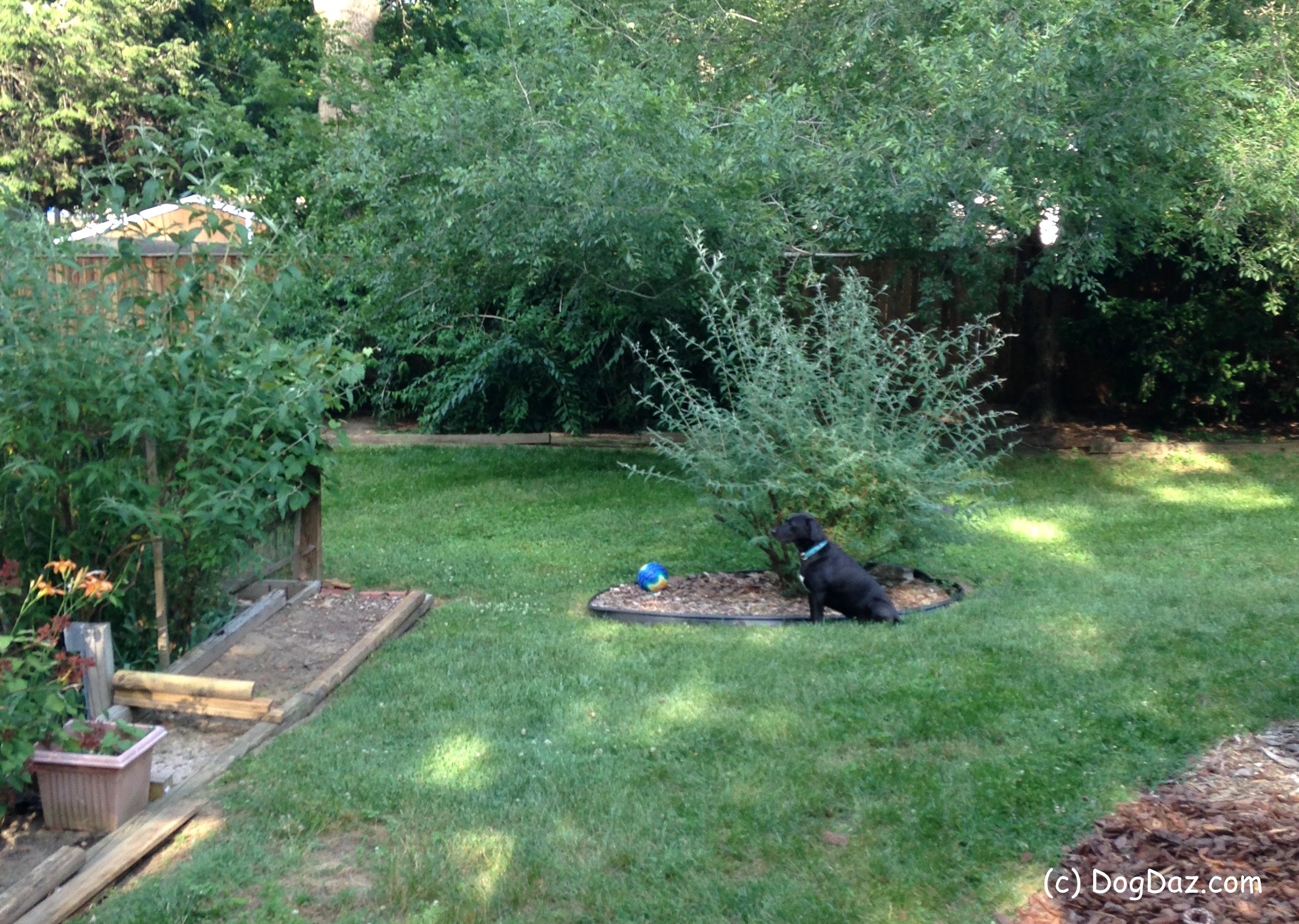 Sofie likes to relax under the big tree in the mulched yard. No grass has grown there for a very long time. Not only is it fun to lie on, you can chew sticks at the same time.