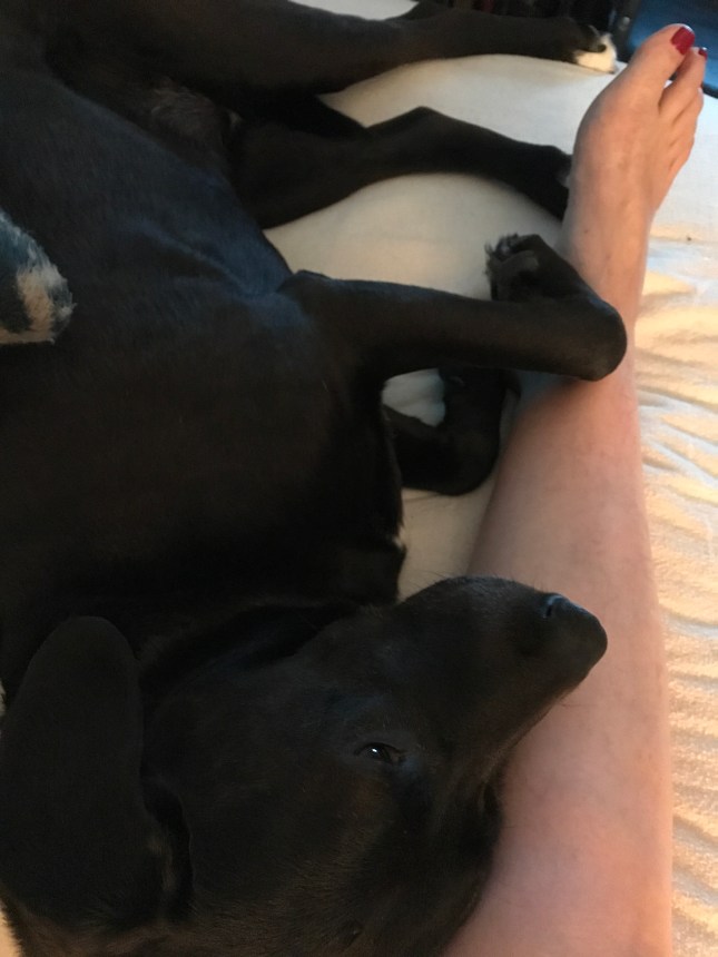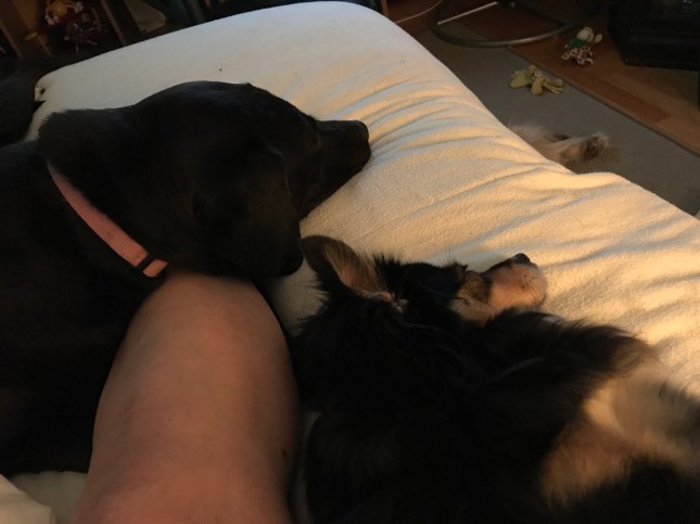 Louise thinks she is a small dog and tries to cuddle up as tight has she can to Mommy’s good leg. It gets a little crowded.