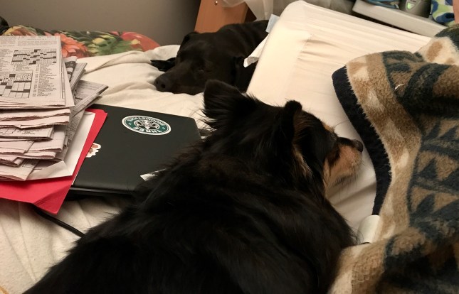 Mom is lucky that Sofie mostly stays on the floor because, with 2 computers, 2 dogs on the bed, a leg cast, a giant leg pillow, and all her files and crossword puzzles, there is hardly room for her on this little bed.