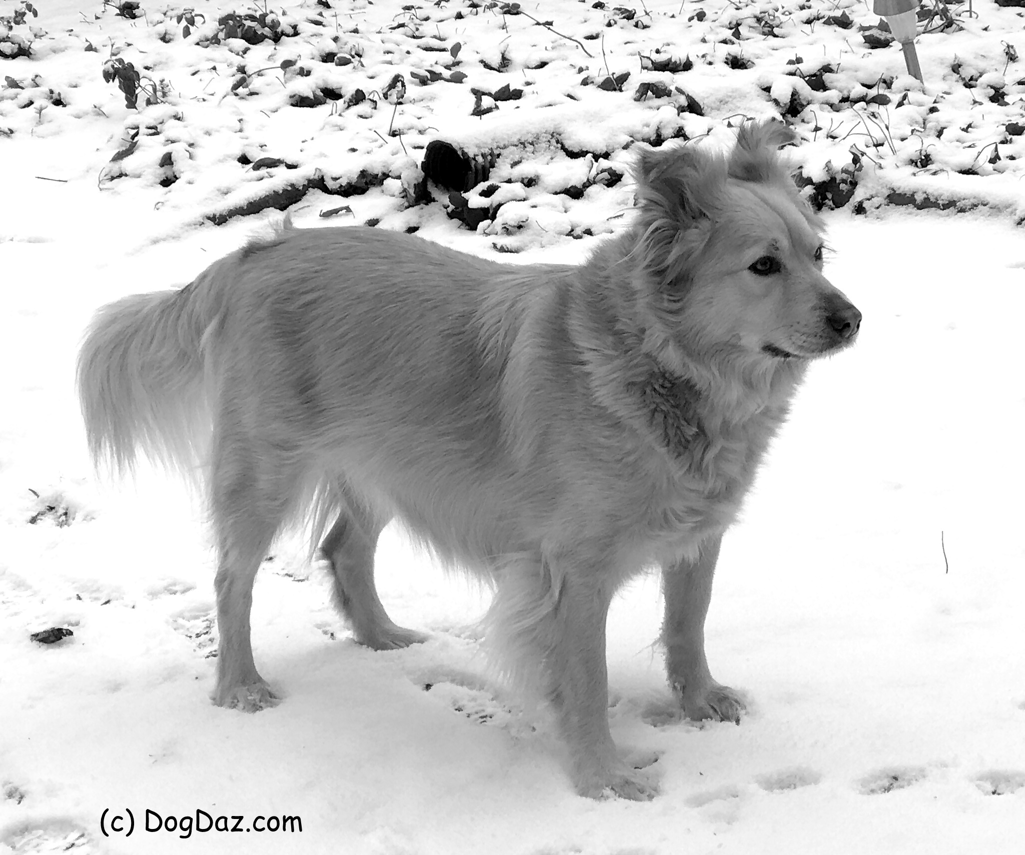 Sofie, the snownose, in the snow. Several winters ago, Sofie’s black nose turned white. They call this ‘snow nose.’ It is the lack of pigment in the cold weather. You can read about it from my post back in 2013. Funny thing with Sofie’s nose, it never totally goes back to black.