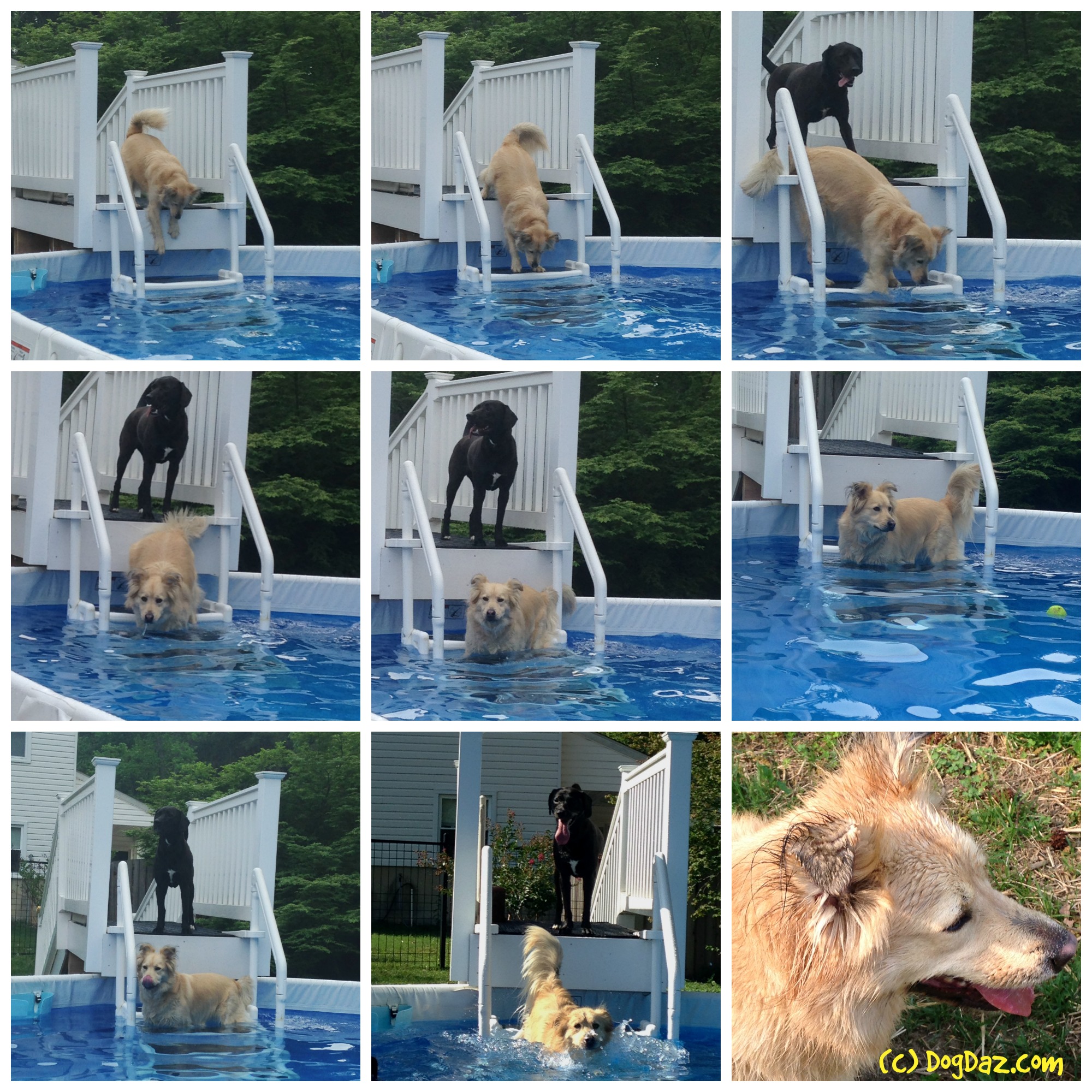 Memories: On a hot summer day, in 2014, Louise’s boyfriend next door, Mojo, wasn’t home but they went over to swim with his baby sister Zelda instead. It was so much fun. Louise really wanted to play with Zelda’s toy but she would not go in the pool to get it. Louise doesn’t like to get wet (she hates rain too). Sofie, on the other hand, was brave and got all the way in. She loves to swim but has trouble with puppies. That day swimming won over puppy fear.