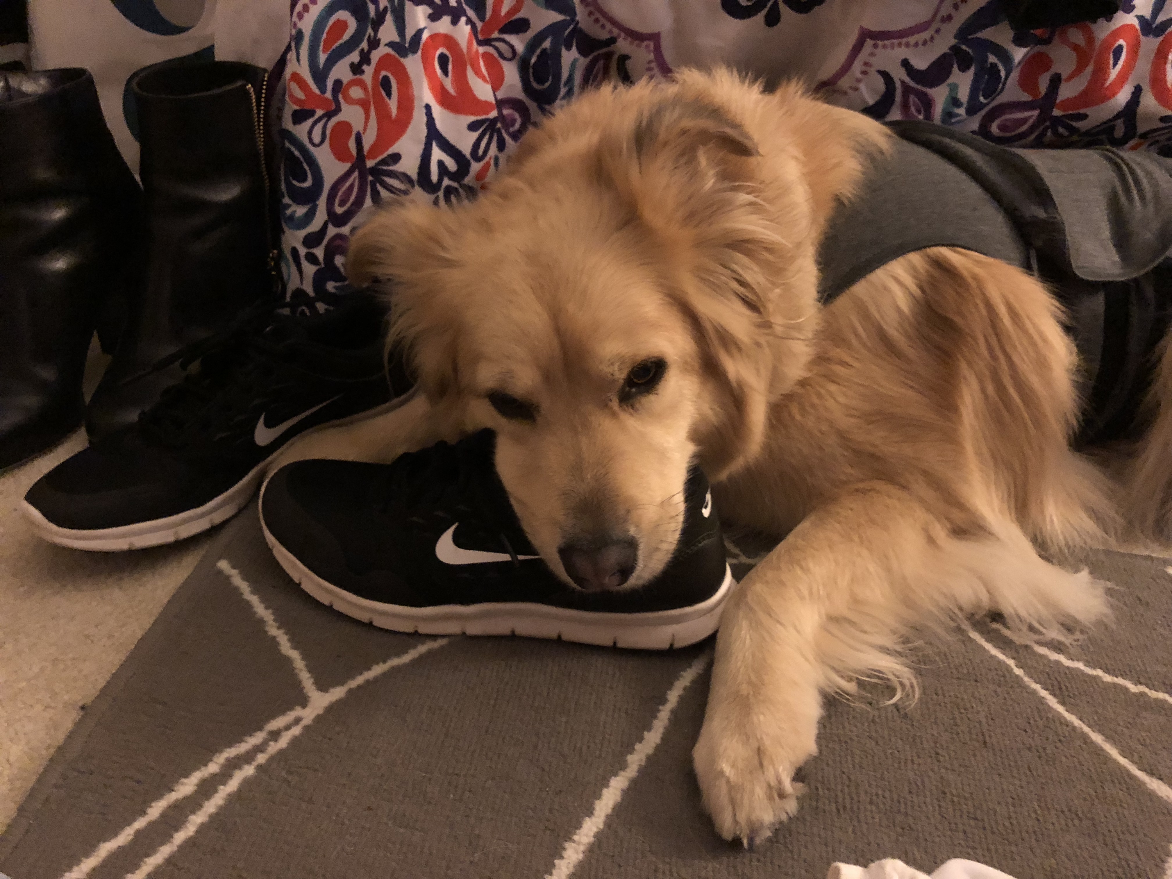 I’m wearing my thunder shirt but it doesn’t really help anymore. It used to help me years ago, but now it is just this too tight thing that Mom makes me wear. I am still scared. Maybe these shoes will protect me?