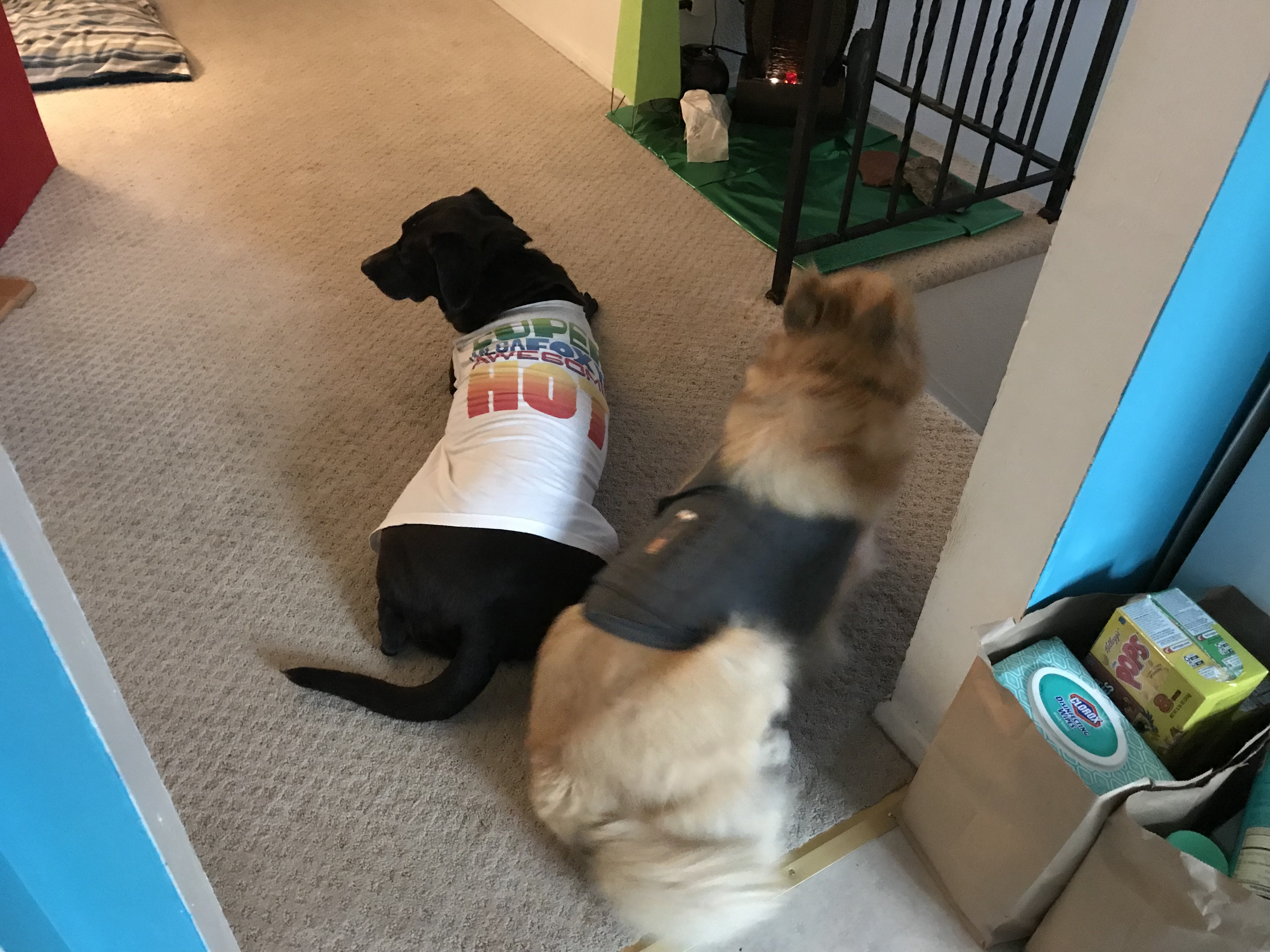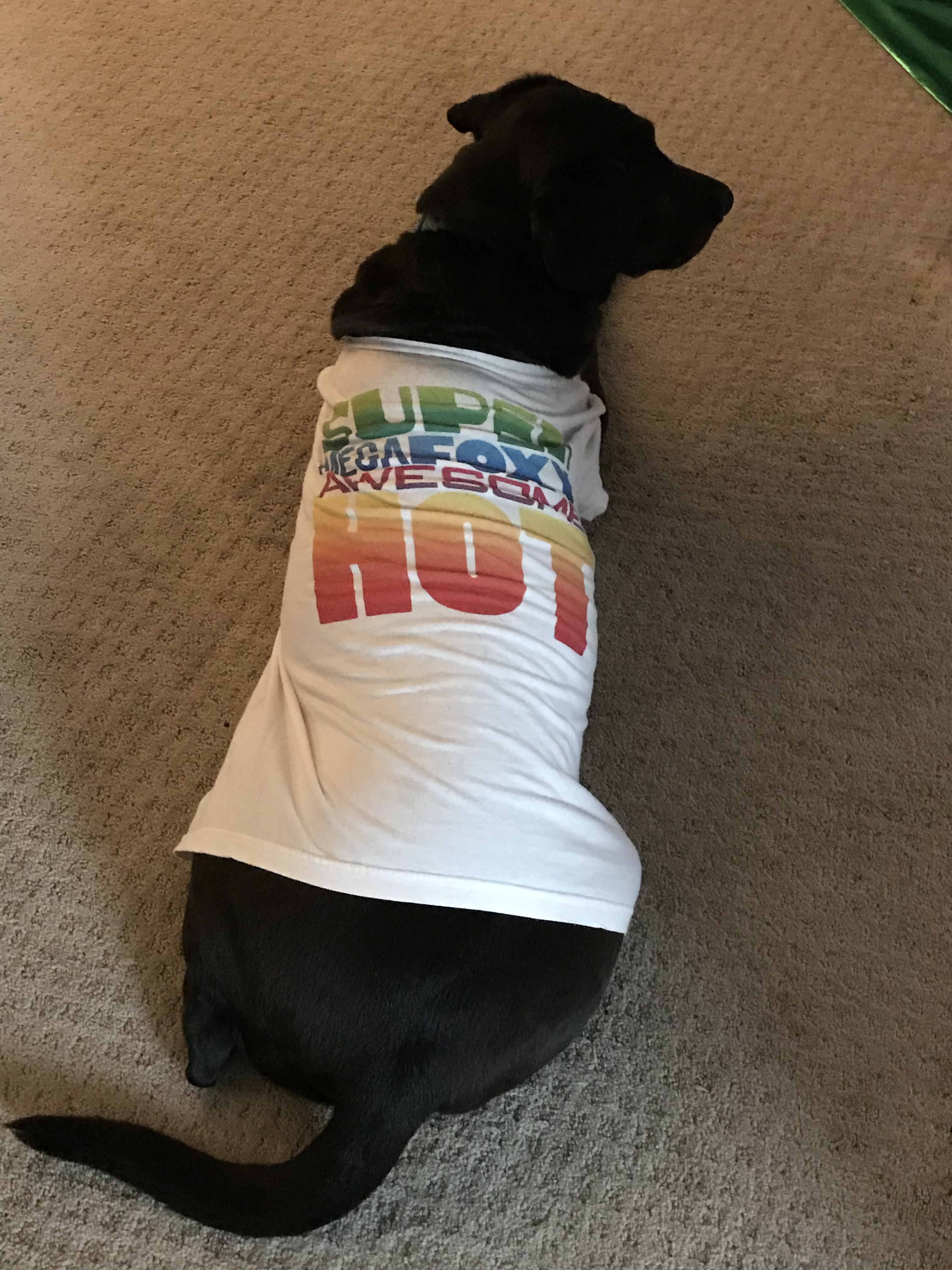 Mom put a shirt on Louise because she is also scared of storms (V thinks she caught the fear from me). Louise doesn’t have one of these fancy thunder shirts like I have so Mom found an old shirt in Peanut’s giveaway pile that seems to work really well. I am not sure if it helps her any more than my thunder shirt helps me, but….