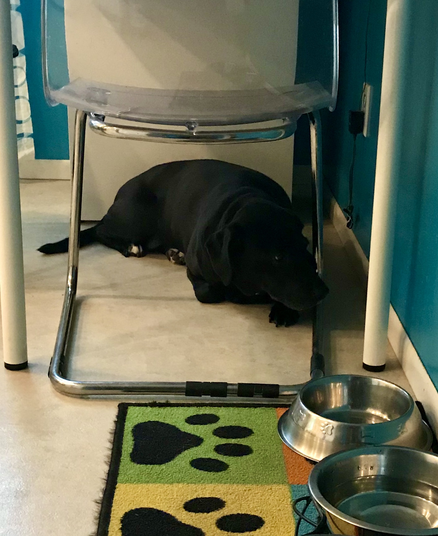 Louise hides under any table or desk that she can find, but nothing seems to work for long. This is not good when you have multiple animals with Noisephobia. I am really starting to hate the 4th of July and summer storms.