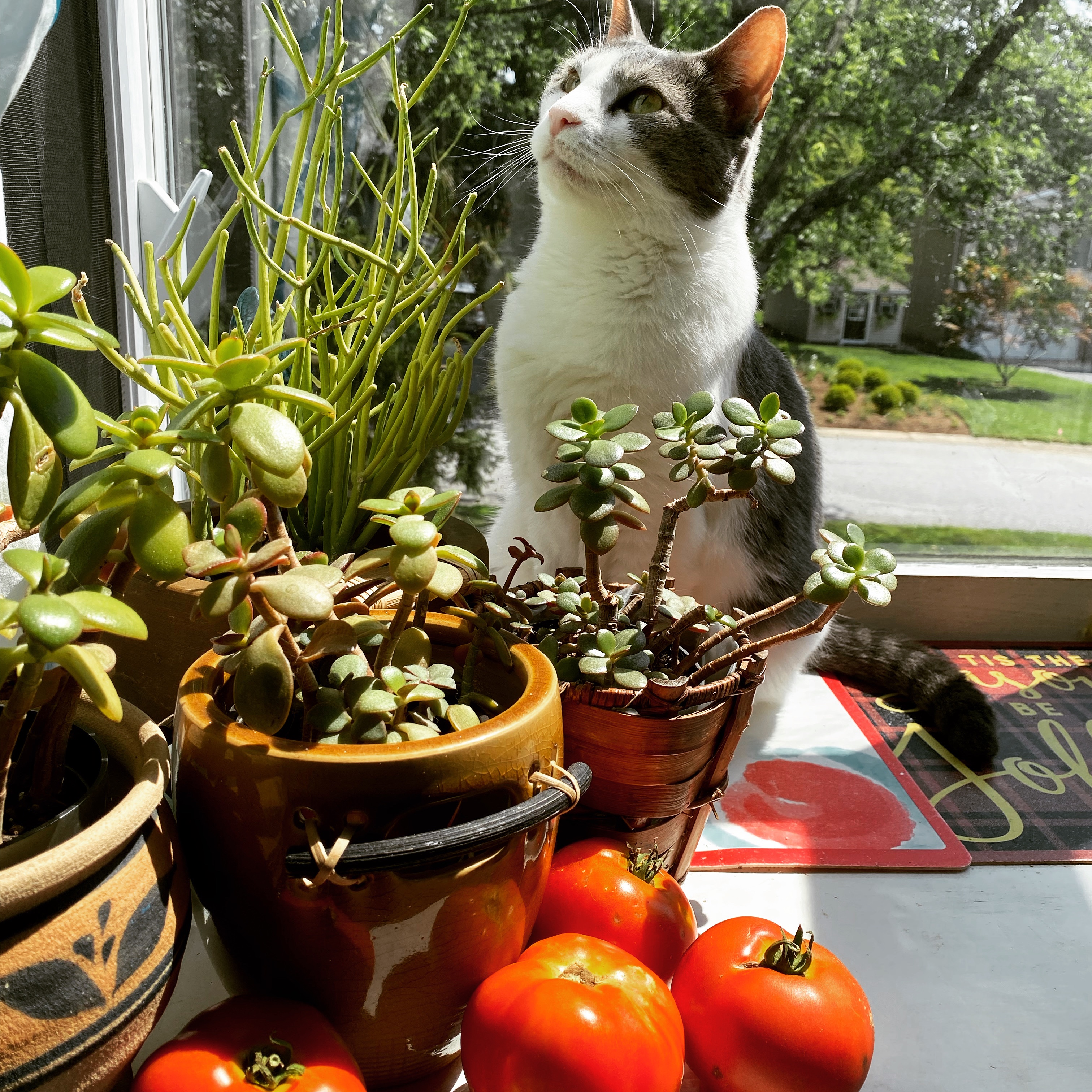 This was Muffin (RIP), on the first crop a few years back. The current cats (Noel, Nine, & Stella) only like to bat the toms around and use them as toys. The Muffin Man (aka Muffy, Muffin, Mr. Wonderful) was an extraordinary cat, just like this year’s crop.
