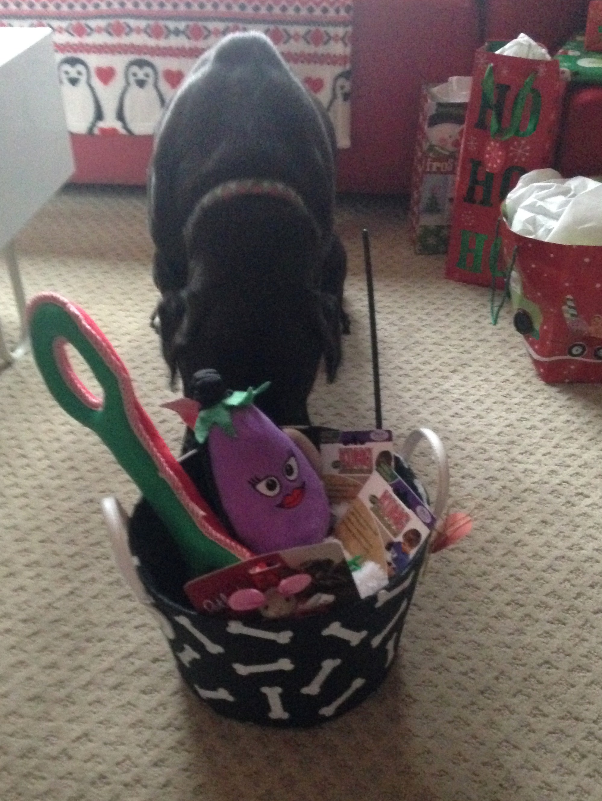 Rachel, our wonderful dog walker (Simplifido.com), who takes us out when Mom is working and feeds the cats if she goes away, gave us this great basket of cat and dog toys for the holidays. Santa (we know it was you Mom, we are not puppies and kittens any more) added a bunch of cat and dog toys to it. We were very excited Christmas morning to have a punch of things to play with.