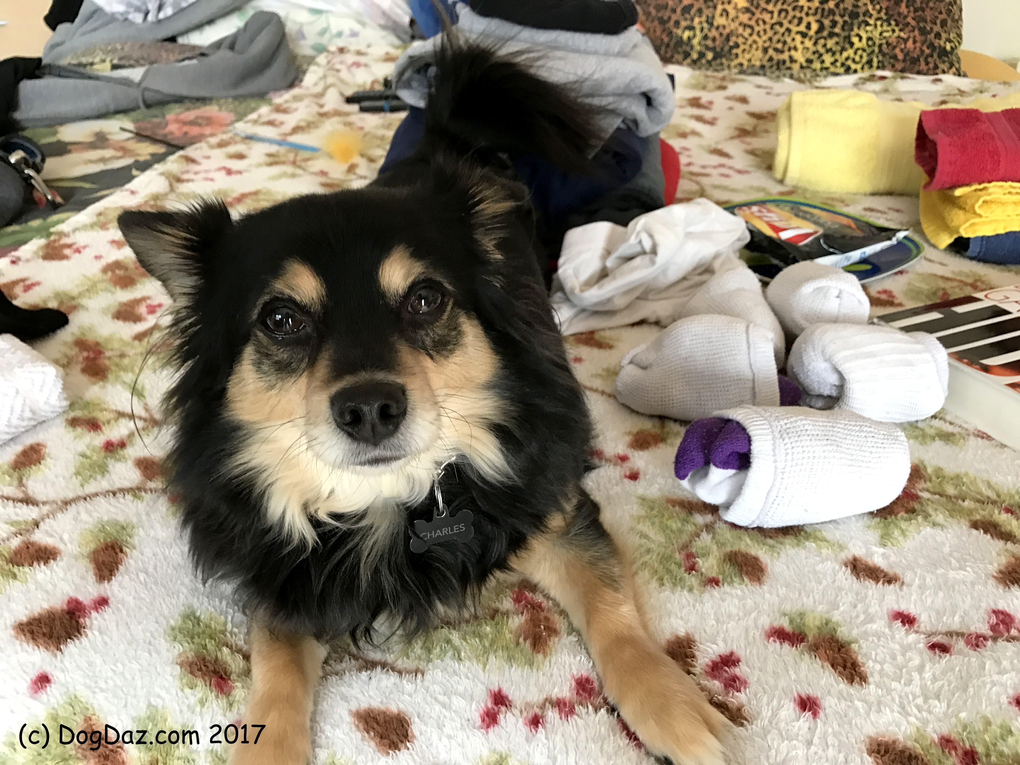 I am used to a cat or 2 helping me fold the laundry. They like to lie on the warm piles when they first come out of the dryer. And then, of course, they will make a nest in anything black (of which 99% of my clothes are). Since I never had a small dog before it didn’t dawn on me that he would want to assist in the process just like a cat. Charles’ favorite laundry activity seems to be batting the socks around as they got paired. Every chore is a new adventure with this little guy. I definitely am learning that little is different then middle and big. Though Louise does like to play peek a boo, when I toss the sheets out in a whirl to fold them, and Sofie will suck on anything that is soft and nearby.