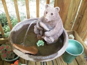 Several years ago, at the end of the summer, we found this broken bear fountain at a local garden center. We love to shop for things at the end of the season because we can find wonderful things at prices we can afford, So what if they have some pieces missing or are a little chipped or ragged, they would get that way around here pretty quickly anyway. So Bear has been a summer time favorite of ours for many summers. The pieces that hold him up in the water are not the original ones and are 3 broken shards of pottery, so every year we spend hours trying to get the bear to sit just right and then adjust the pump to not spray out of the bowl. It is a ritual of sorts. I finally figured out if I put a piece of pottery at the end of the stream, than the splash seems to stay in the bowl instead of all over the deck, unless of course the wind is blowing. We have fountains all over the property and inside the house as well. I guess it is very Feng Shui to have water strategically positioned, but we did it because we really enjoy the calming sound (and the effects of the negative ions generated by the constant running water (you knew that of course)). The fountain at the top of the stairs is the cat drinking fountain. I am sure they think we installed it for them. We have fountains at every entrance.