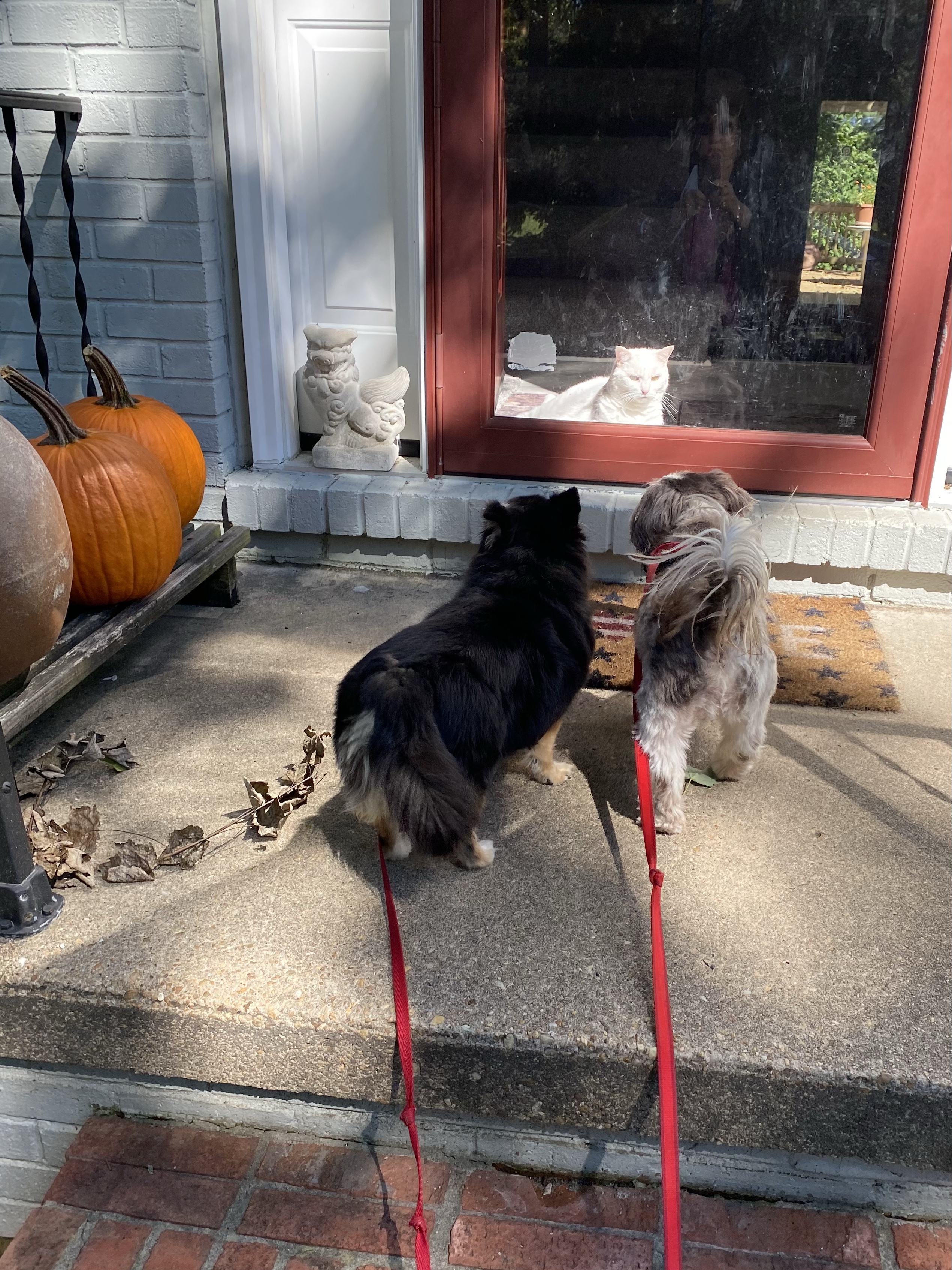 Queen Noel very rarely suns herself at the front door anymore. Her habits have changed a great deal with her age (now 15 1/2). She mostly stays up in her herb window or on Mom’s recliner in the living room. But today, she was there to meet the Littles as they returned from a crisp fall walk. Charles even brought a whole dead branch as an offering to the Queen.
