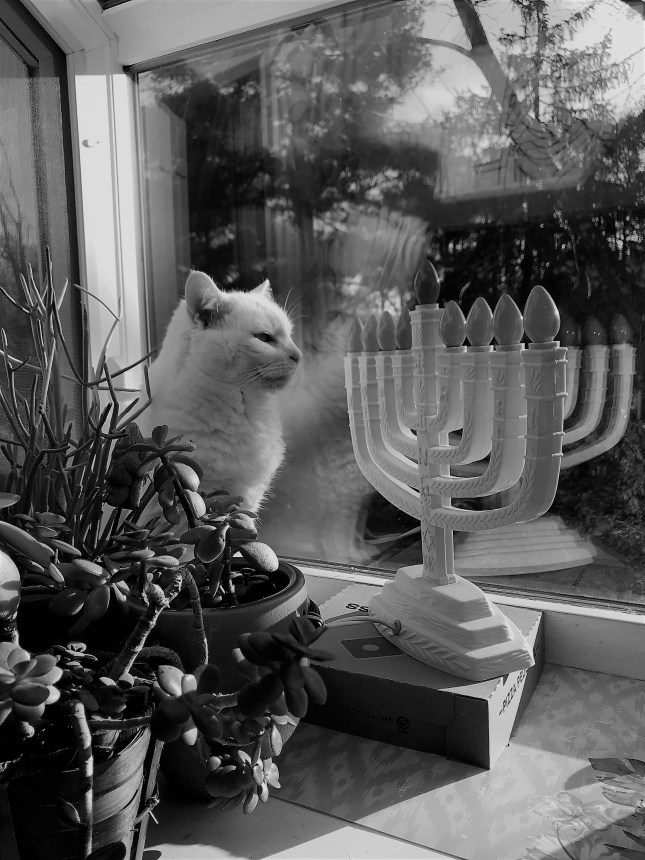 It always makes me sad when it is the last night of Hanukkah because I really enjoy the lights. Noel, on the other paw, isn’t sure that having this big hanukkiah (menorah) in her window, taking up a lot of space, is a good use of her favorite place.