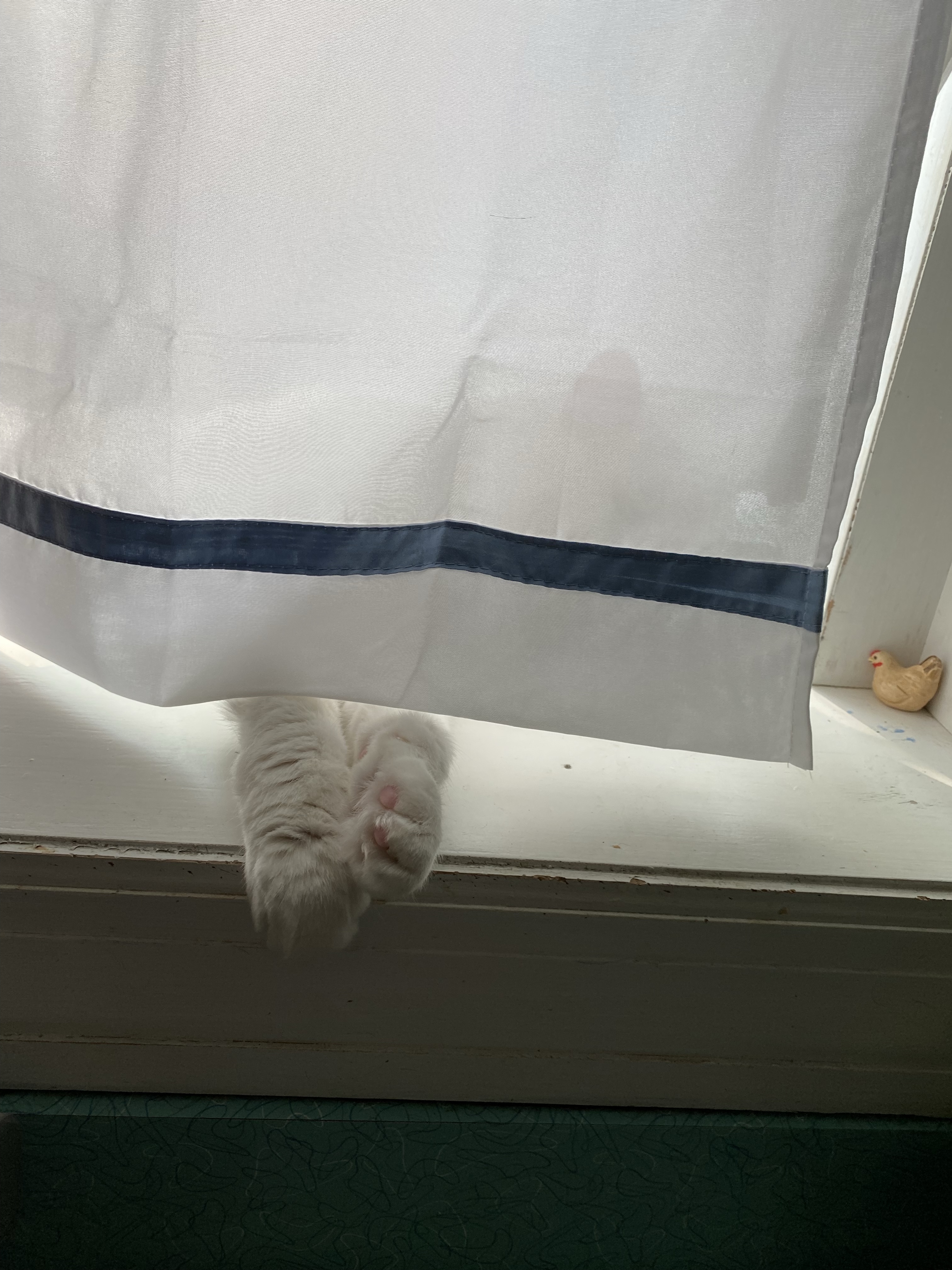Noel, the Christmas Cat, here: Mom put the summer curtain up in my herb window because the sun heats up the whole kitchen in the afternoon. She also takes all the plants out of the window so they don’t burn up. I love when she does that. I can sleep in that window for hours and spread out.