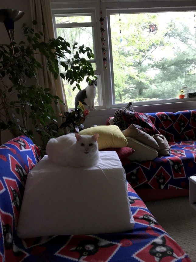 Mommy is having foot surgery next week and won’t be able to walk for awhile. She got this new leg wedge pillow to keep her foot above her heart. I have decided that it is my new favorite place to sit. It is mine and I like it! I guess Mommy will have to cancel her surgery because she will have nowhere to put her giant booted foot. Oh well, the dogs will be happy. She won’t be able to walk them for 2 months, which means, lots of cat cuddle time with me! I like that idea too!