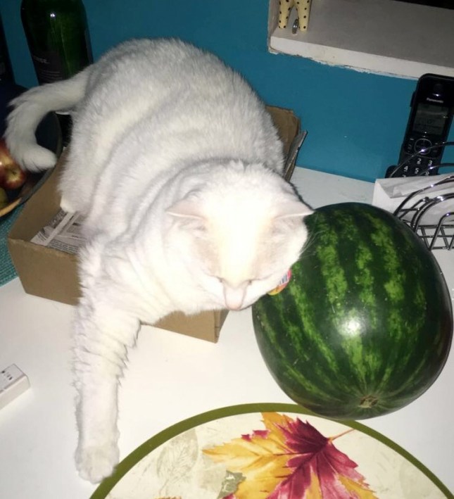 Cats sometimes pick the oddest things to sleep on. Here is Noel, in the newpaper box on the table (her recent favorite hangout), sleeping against a watermelon. It sure does not look comfortable to me. She is a funny girl, that Noel. You just have to love her.