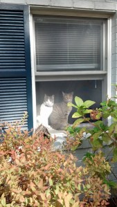 Its very rare that we have windows open these days because the temperature has dropped, so it is a real treat when the day is warm enough and the kitties get to feel the breeze and lie in the sunshine. This was such a day and Nine and Stella were taking full advantage of the moment. This fall has actually been pretty cold (V says I say that every year). We like to have fresh air in the house as long as possible, especially with all the animals indoors, so we open windows whenever we can. There is nothing as nice as an open window, if you are a house cat. >^..^<
