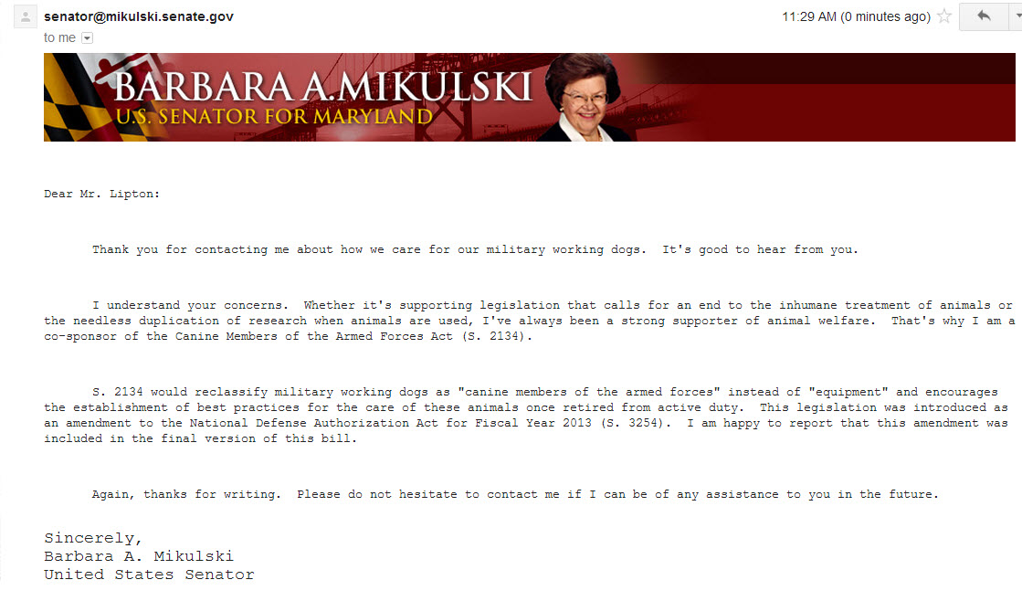 Tags: Canine Members of the Armed Forces, dog, dog rescue, DogDaz, Dogs, Military Working Dogs, National Defense Authorization Act for 2013, postaday, Sentor Barbara Mikulski